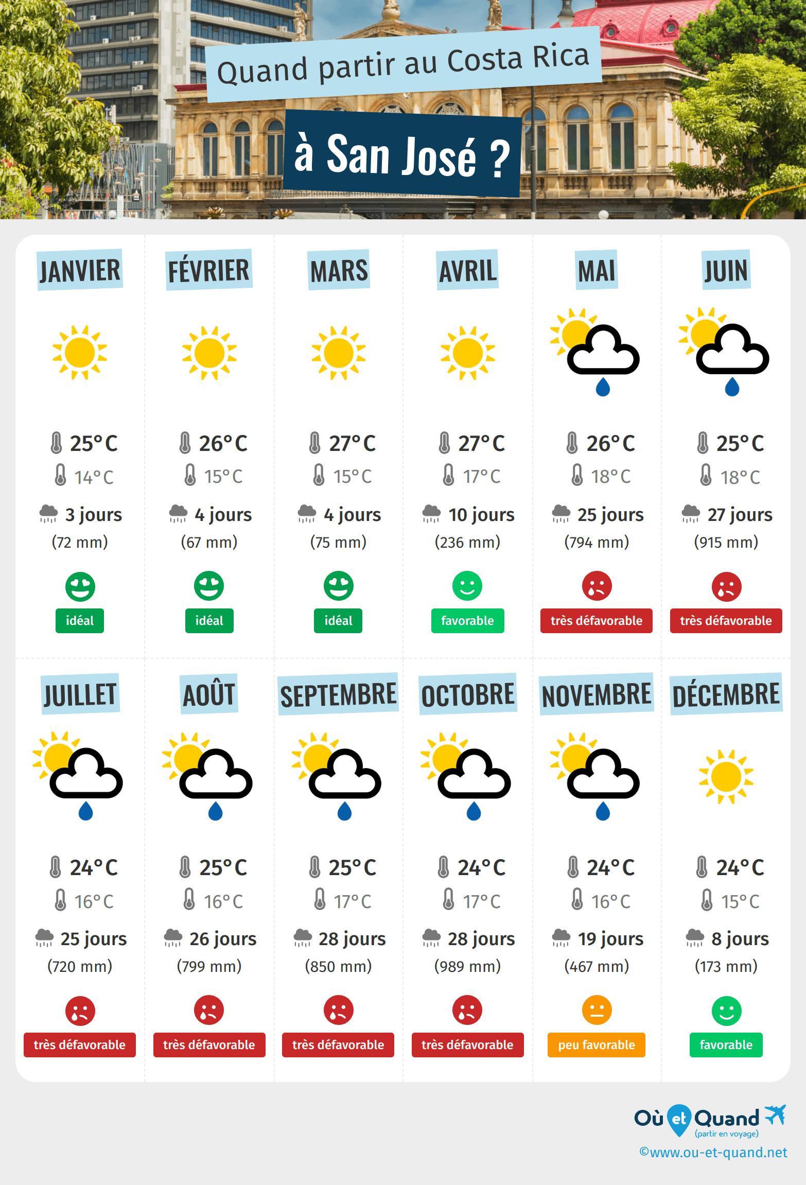 Pour obtenir toutes les informations sur le climat et la météo à San José d'un mois précis, cliquez sur le lien correspondant ci-dessous :