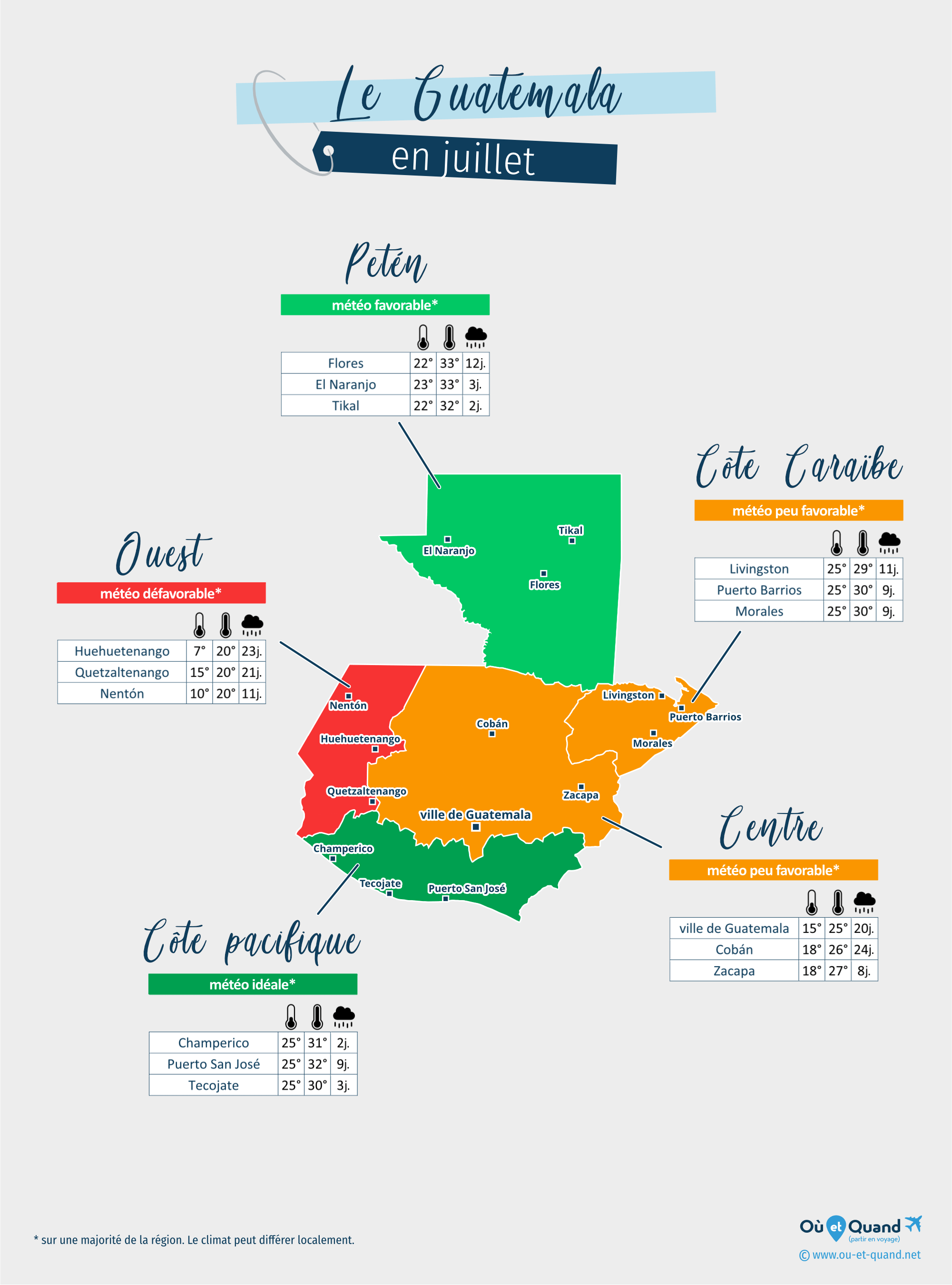 Découvrez sur la carte ci-dessous où aller au Guatemala pour visiter cette destination au mois de juillet avec les meilleures conditions climatiques.
