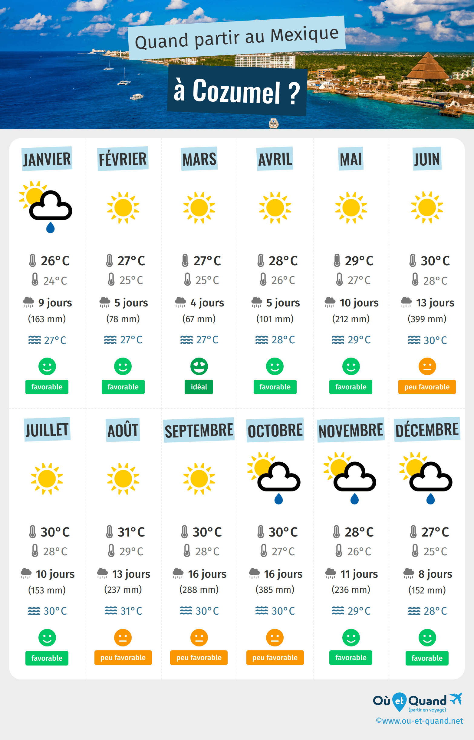 La température maximale à Cozumel est en moyenne de 29°C sur l'année (de 26°C en janvier à 31°C en août). Il pleut 2464mm sur l'année, avec un minimum de 67mm en mars et un maximum de 399mm en juin. Le climat est agréable pour partir en voyage à Cozumel de Janvier à Mai, en Juillet, en Novembre et en Décembre, mais la météo est vraiment idéale en Mars. Pour se baigner, la meilleure période pour une température de l'eau convenable est de Avril à Décembre.