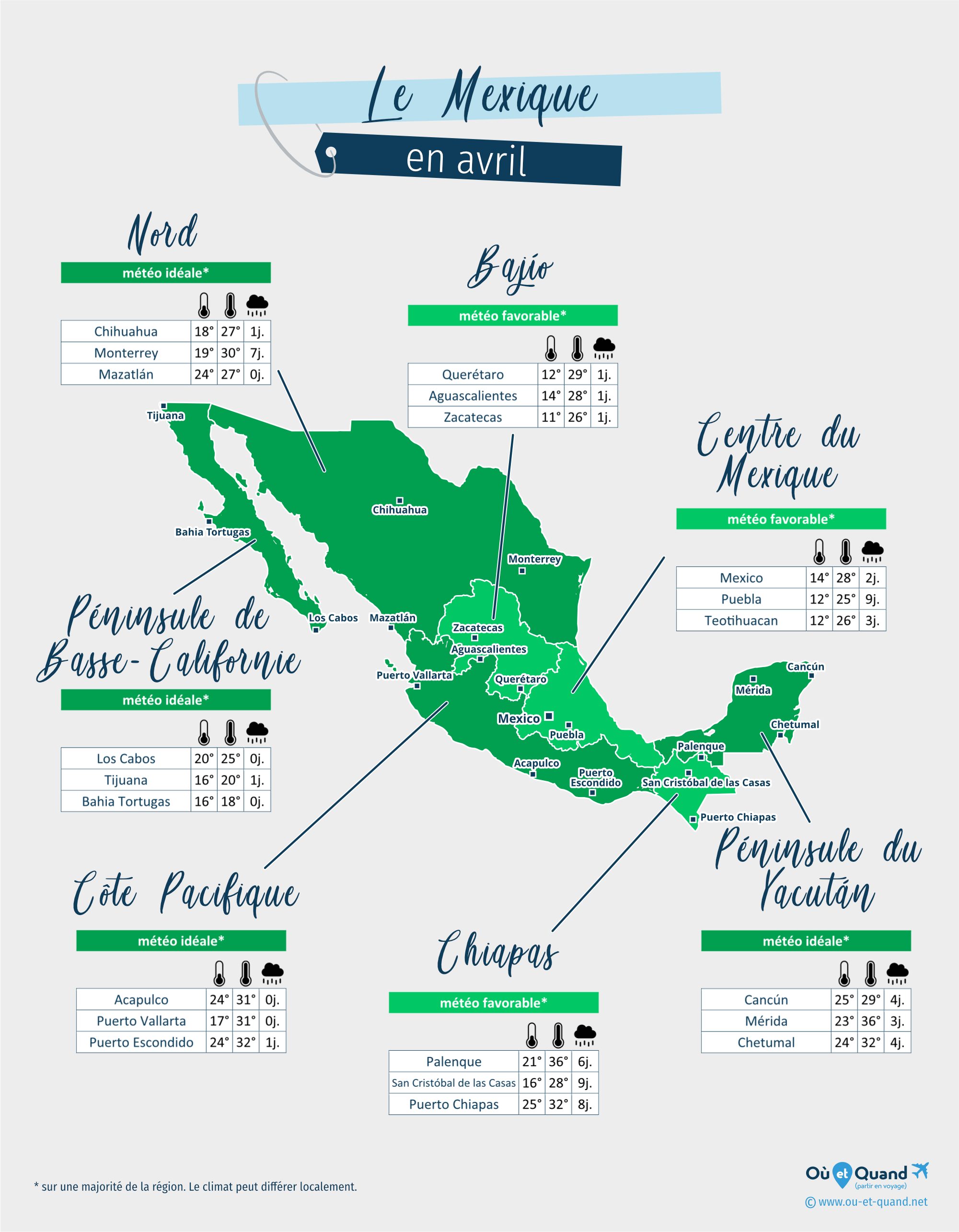 Utilisez les onglets ci-dessous pour découvrir la météo en avril dans chaque zone du Mexique et consulter les normales saisonnières des principales villes.