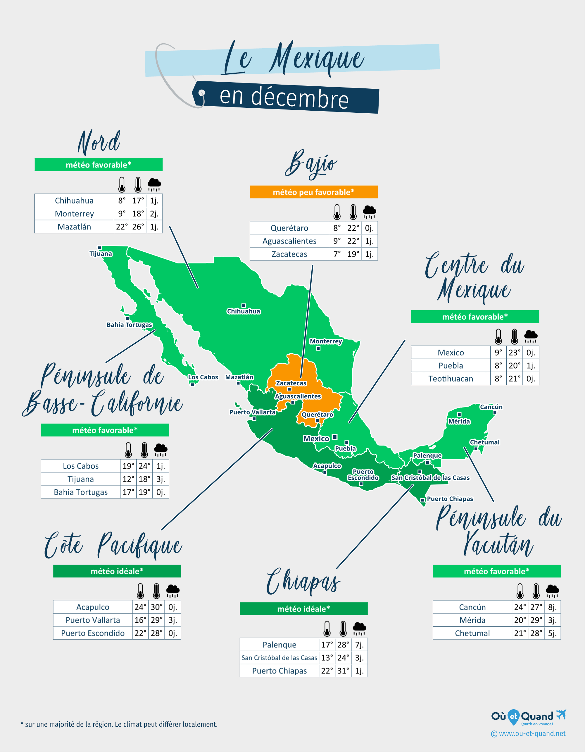 Utilisez les onglets ci-dessous pour découvrir la météo en décembre dans chaque zone du Mexique et consulter les normales saisonnières des principales villes.