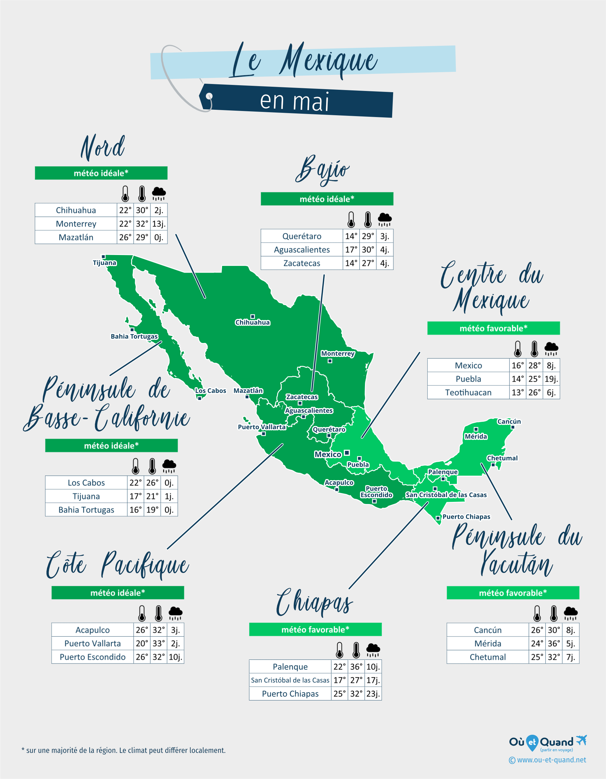 Utilisez les onglets ci-dessous pour découvrir la météo en mai dans chaque zone du Mexique et consulter les normales saisonnières des principales villes.