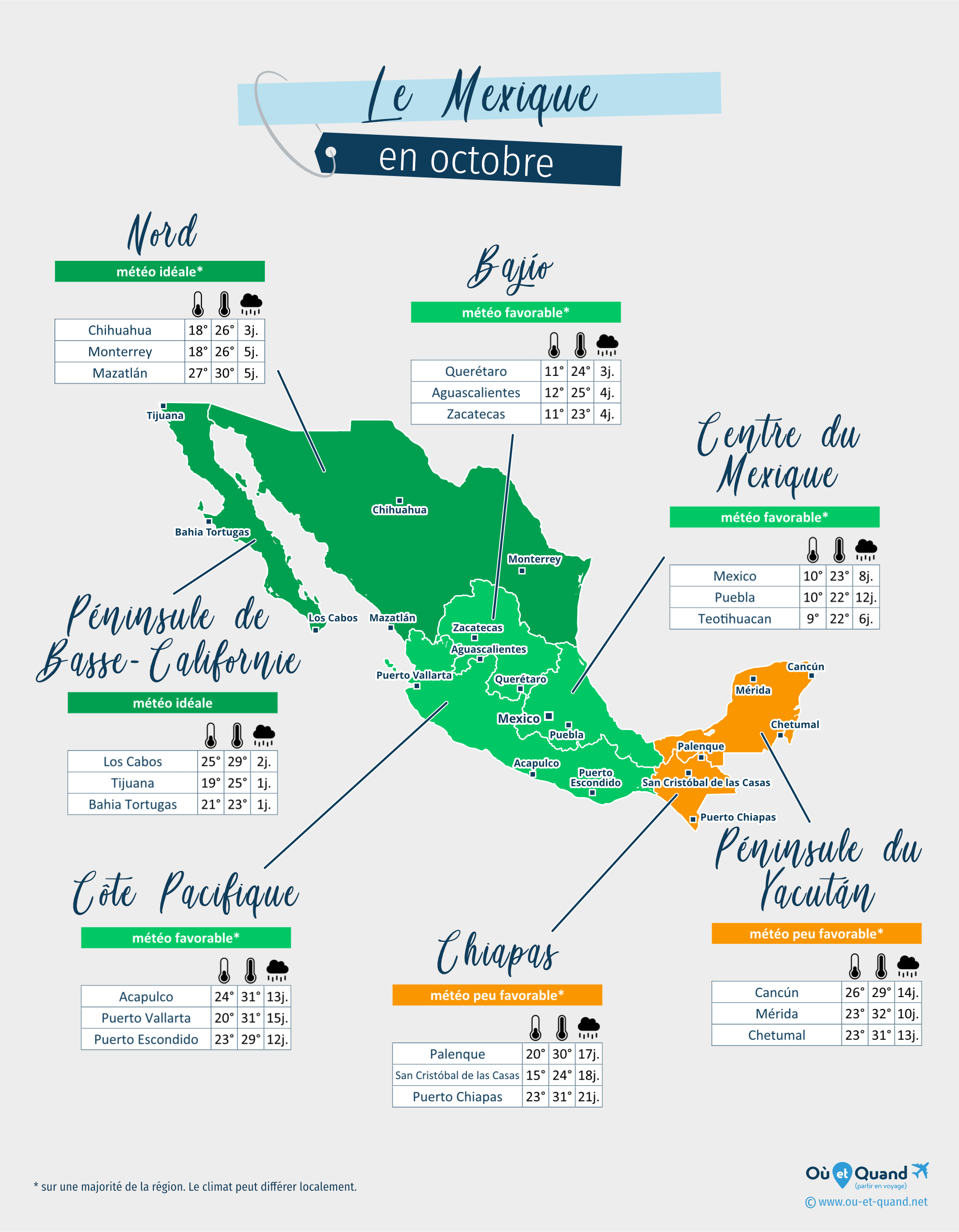 Utilisez les onglets ci-dessous pour découvrir la météo en octobre dans chaque zone du Mexique et consulter les normales saisonnières des principales villes.