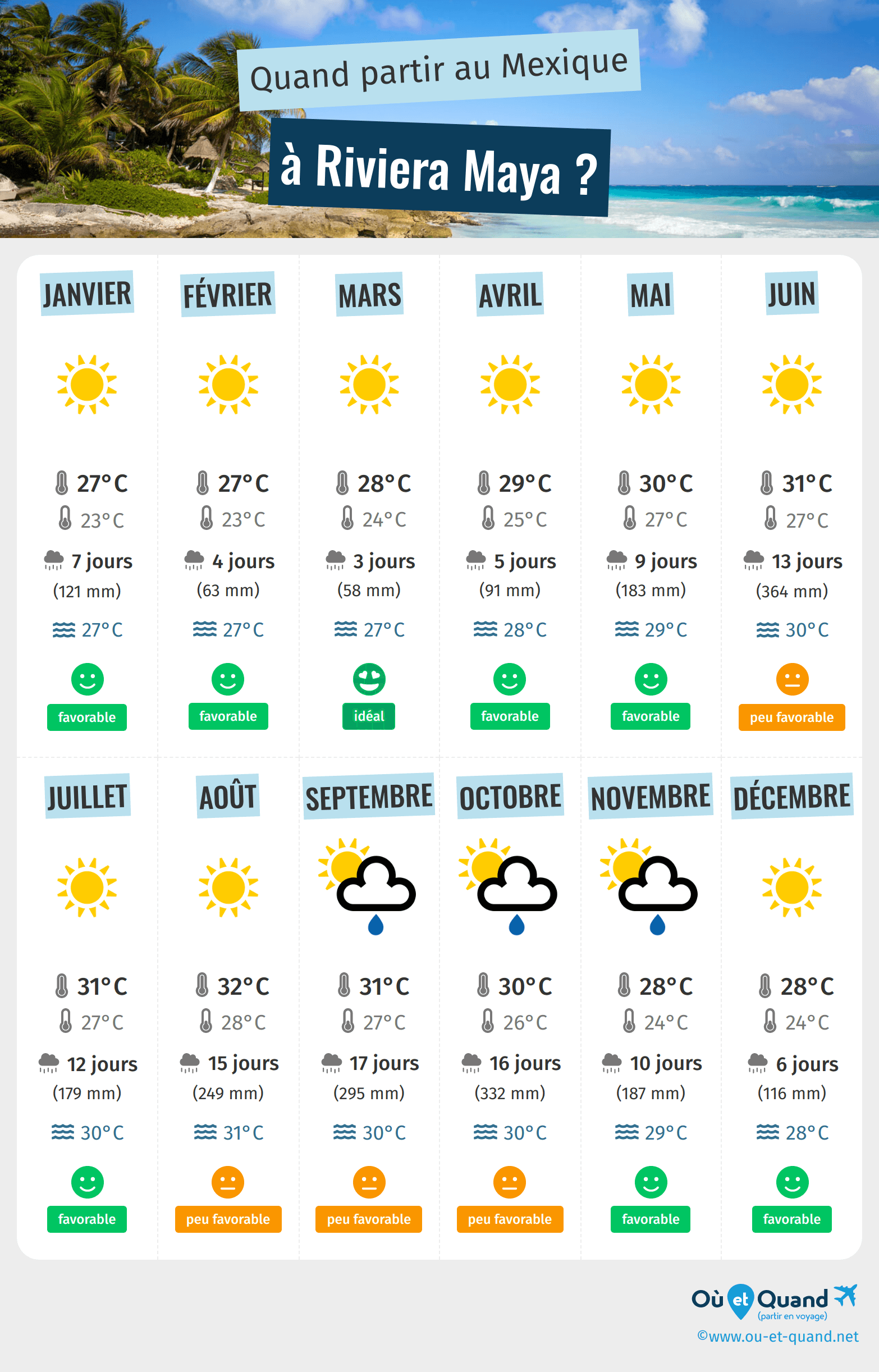 Pour obtenir toutes les informations sur le climat et la météo à Riviera Maya d'un mois précis, cliquez sur le lien correspondant ci-dessous :