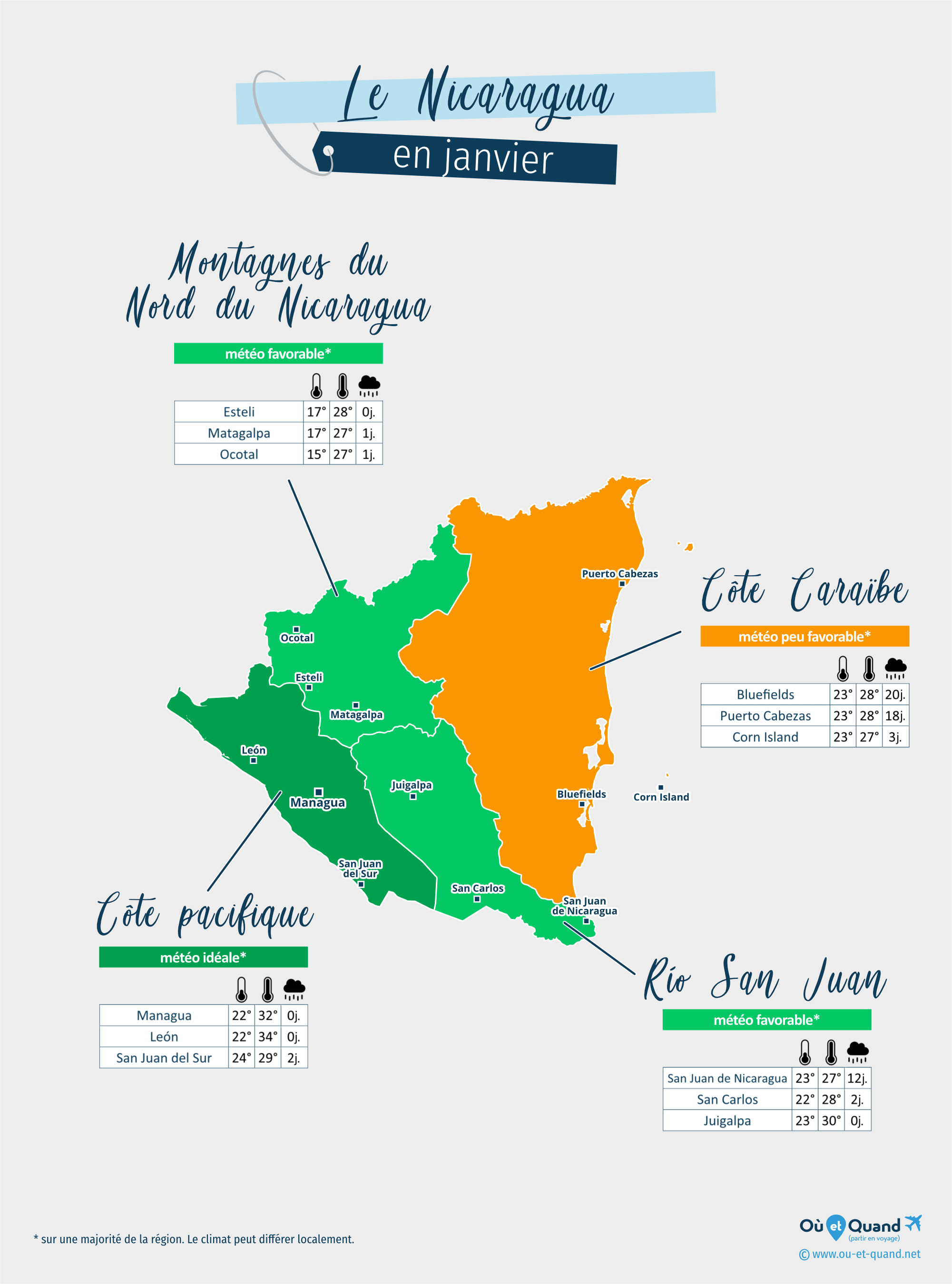 Découvrez sur la carte ci-dessous où aller au Nicaragua pour visiter cette destination au mois de janvier avec les meilleures conditions climatiques.
