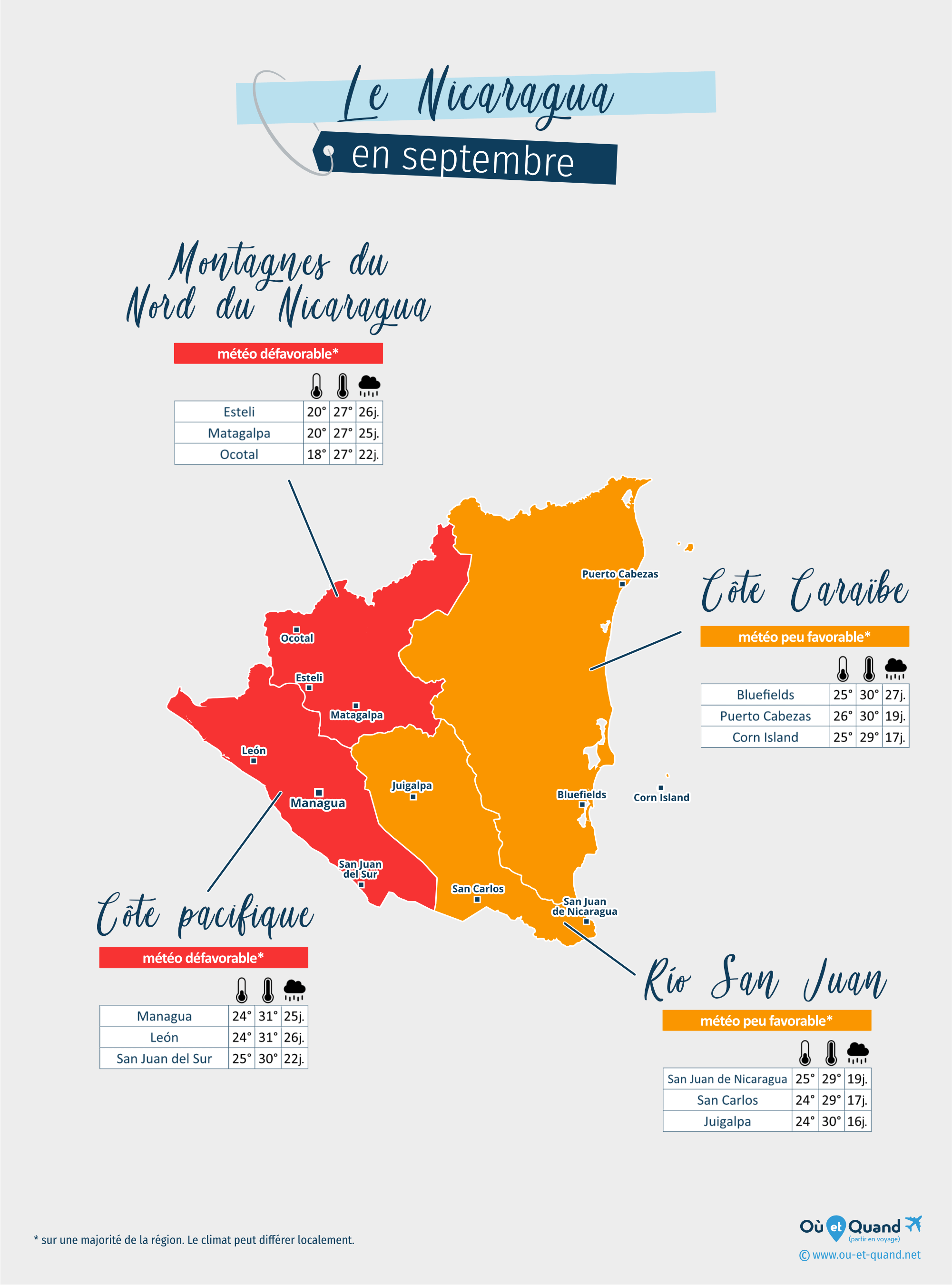 | Côte pacifique du Nicaragua en septembre (Managua, León, San Juan del Sur...) | 29 à 33°C | 11 à 26 jours | 30°C | défavorable* |