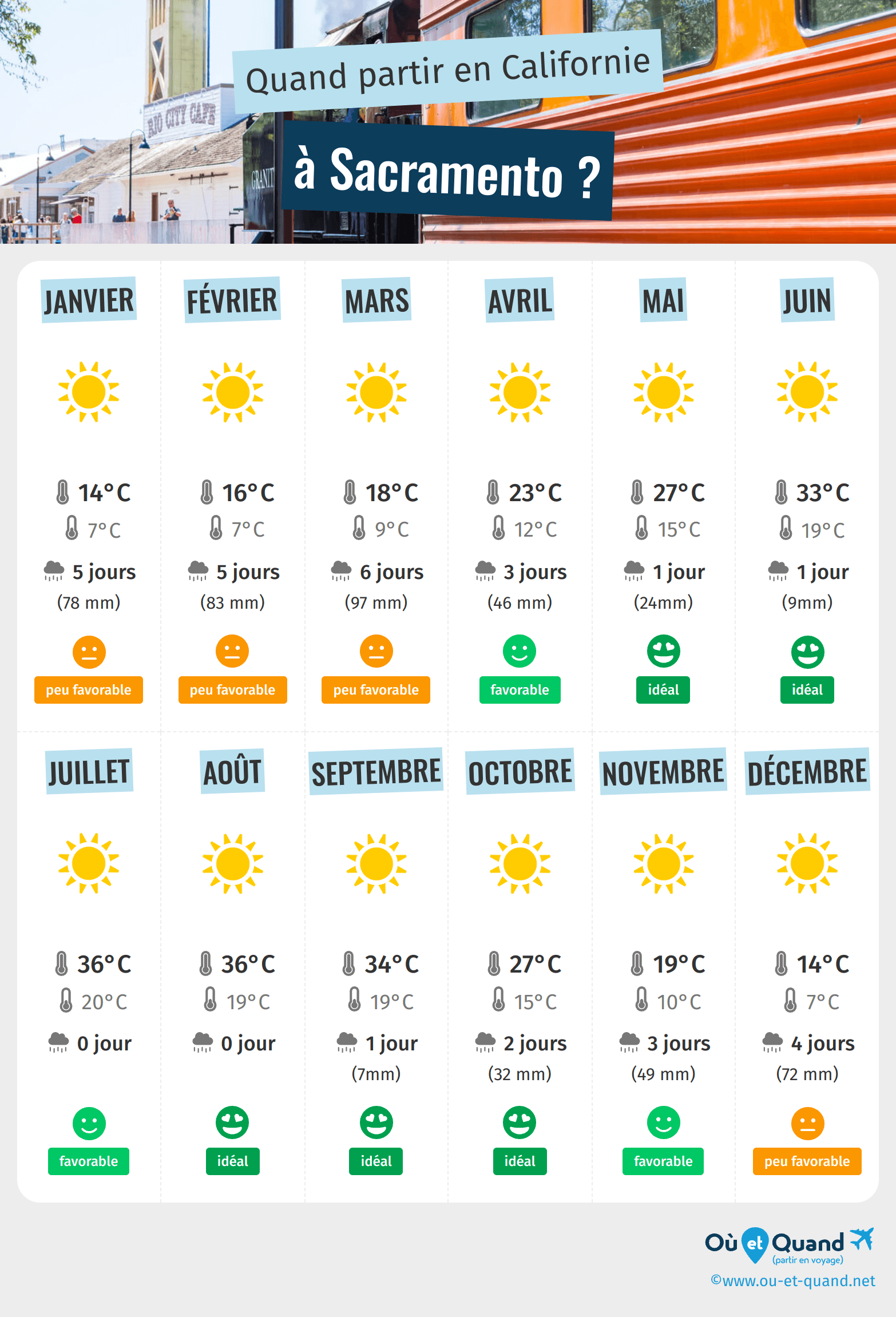 - Haute saison à Sacramento : la fréquentation est élevée en Mai, Juin, Septembre et Décembre.