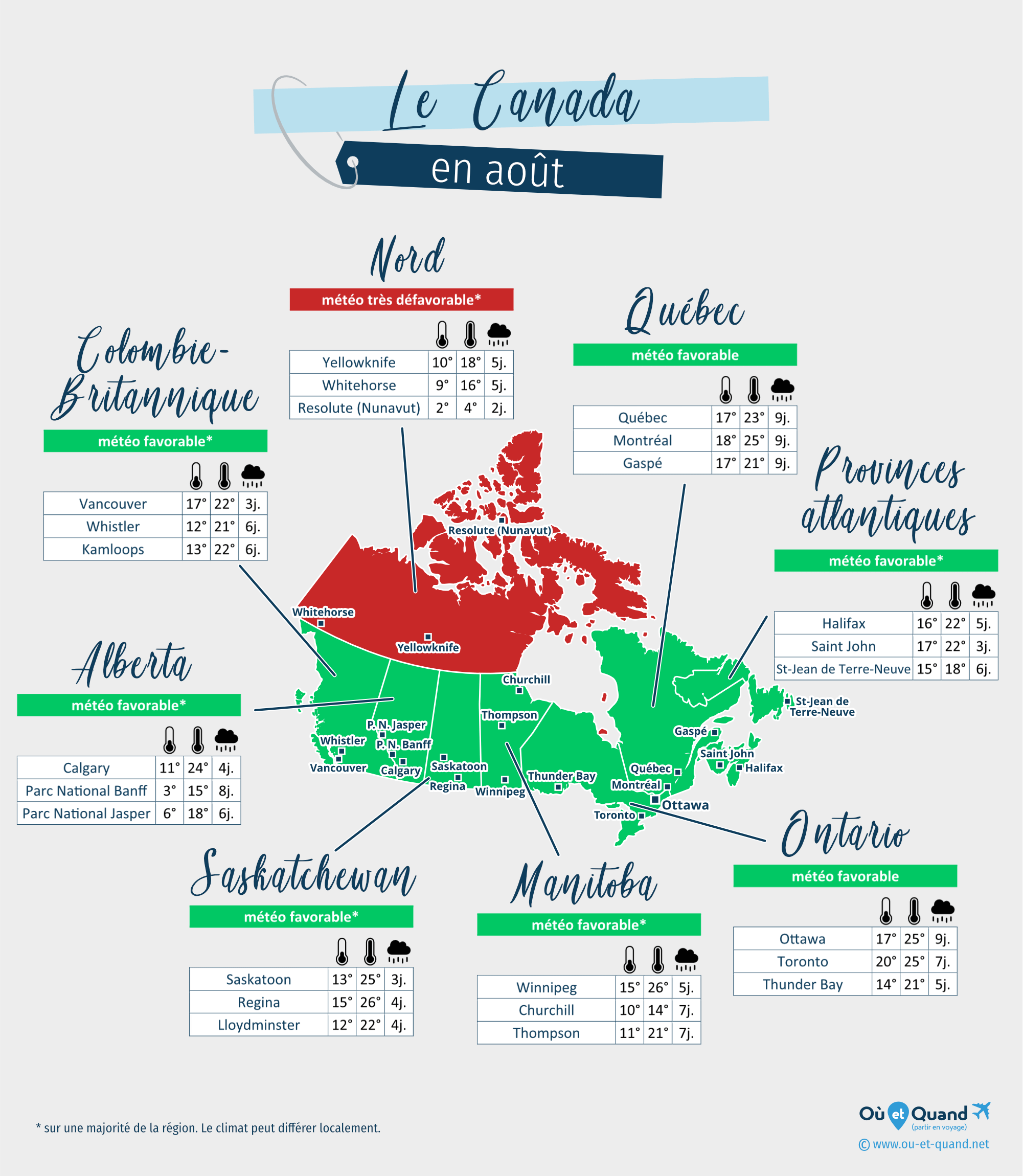 Avec une météo favorable, août est un bon mois pour partir là-bas au Canada.