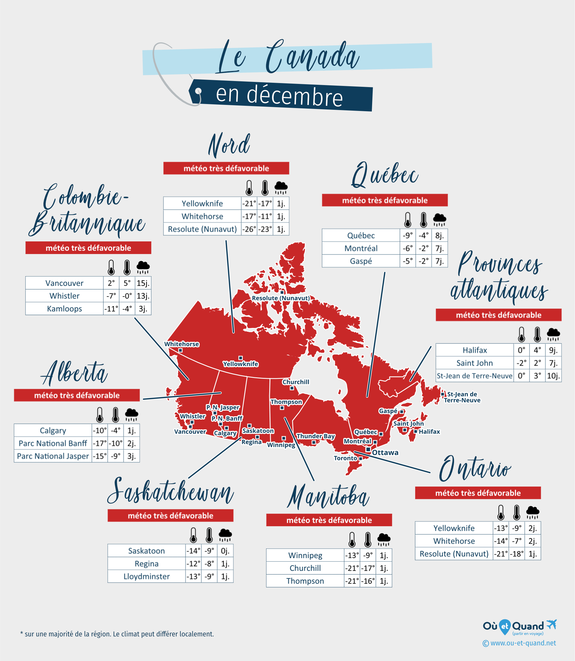| Provinces atlantiques du Canada en décembre (Halifax, Saint-Jean de Terre-Neuve, Saint John...) | -11 à 6°C | 5 à 11 jours | 2 à 8°C | très défavorable |