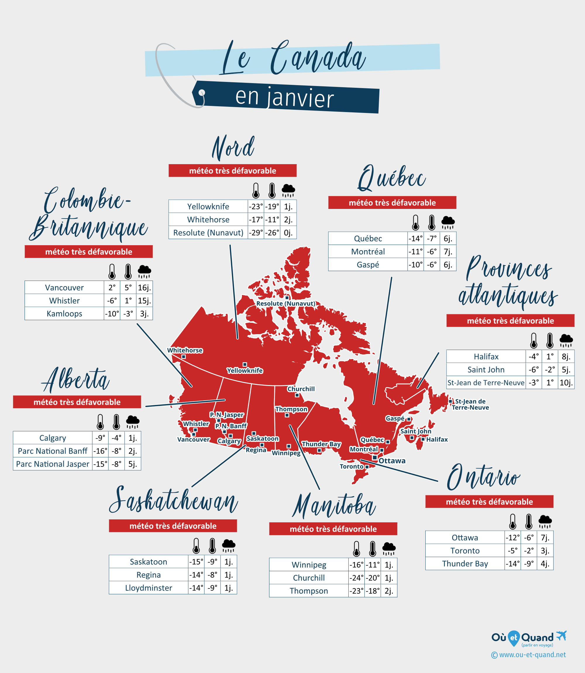 | Nord du Canada en janvier (Yellowknife, Whitehorse, Resolute (Nunavut)...) | -26 à -10°C | 0 à 2 jours | -1°C | très défavorable |