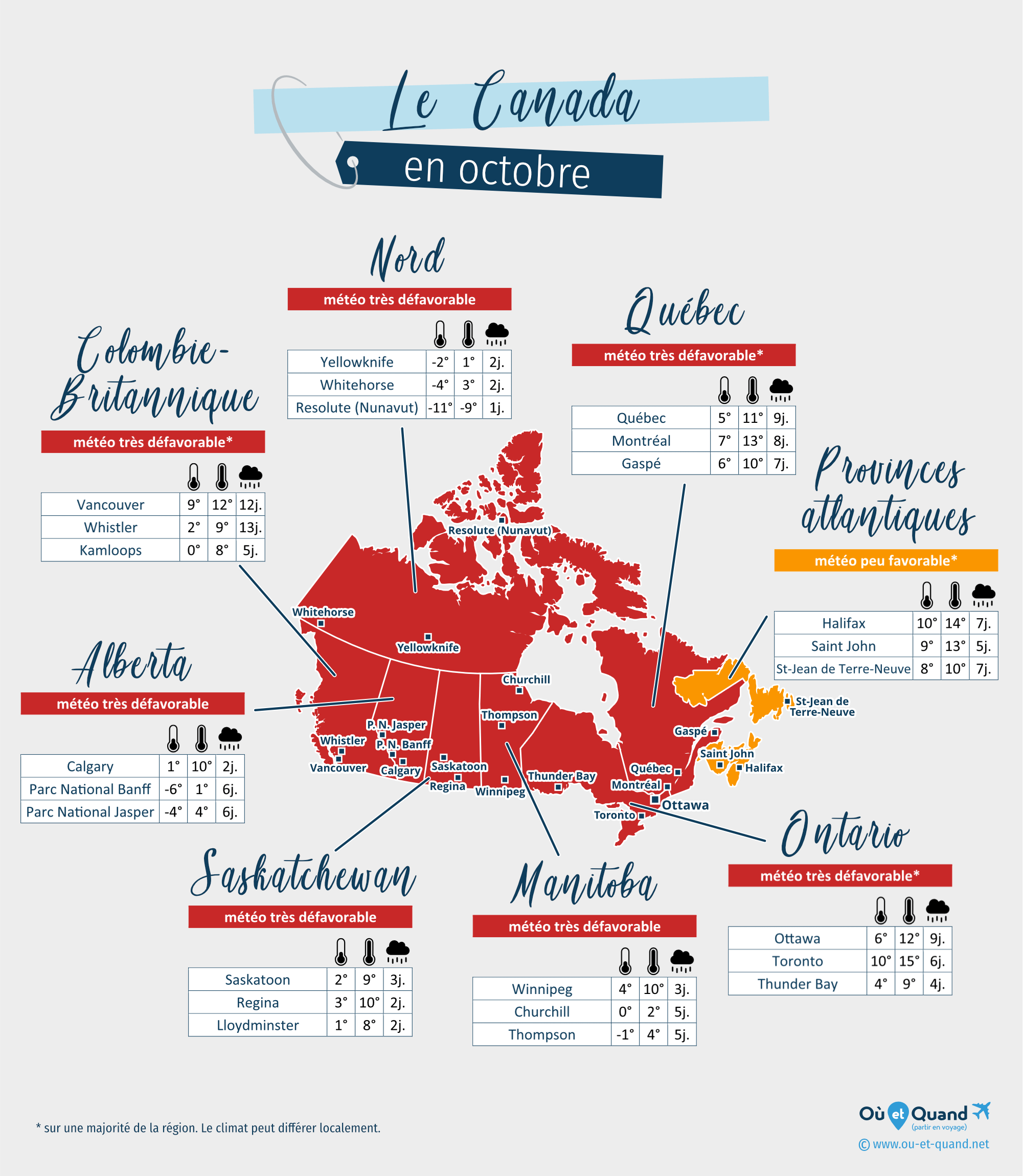 | Saskatchewan en octobre (Saskatoon, Regina, Lloydminster...) | 8 à 11°C | 2 à 3 jours | très défavorable |