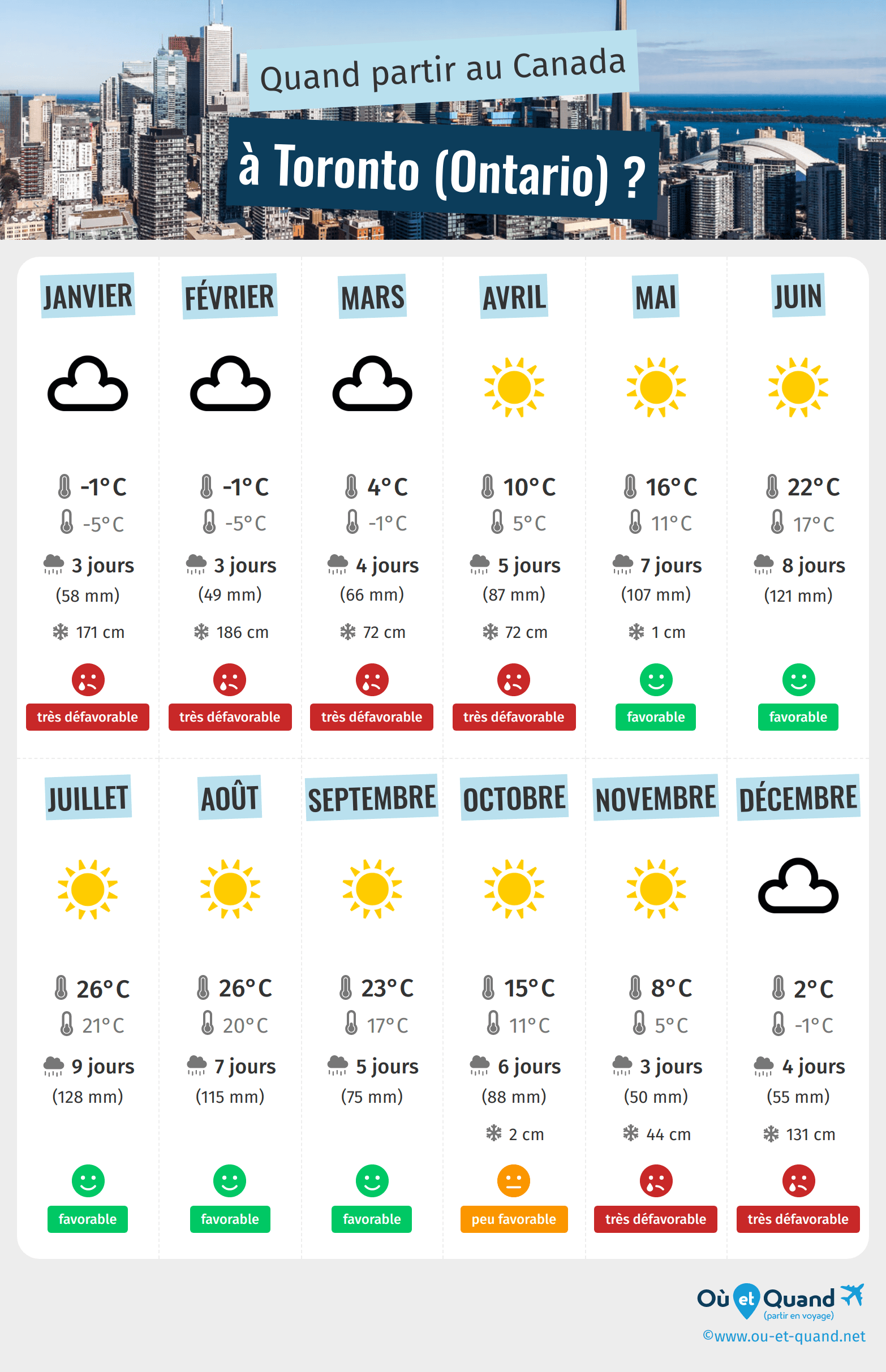 Pour obtenir toutes les informations sur le climat et la météo à Toronto (Ontario) d'un mois précis, cliquez sur le lien correspondant ci-dessous :