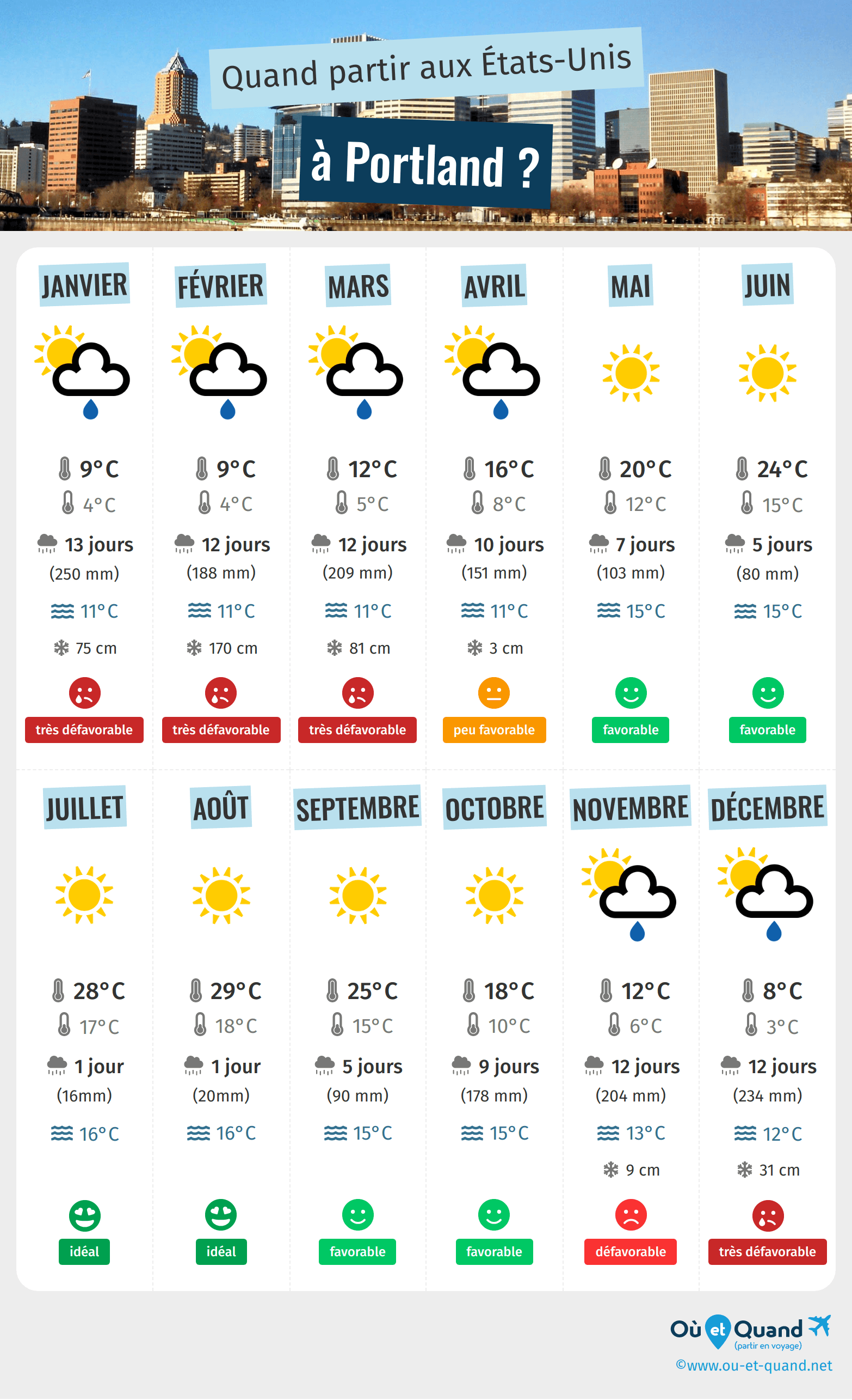 Pour obtenir toutes les informations sur le climat et la météo à Portland d'un mois précis, cliquez sur le lien correspondant ci-dessous :