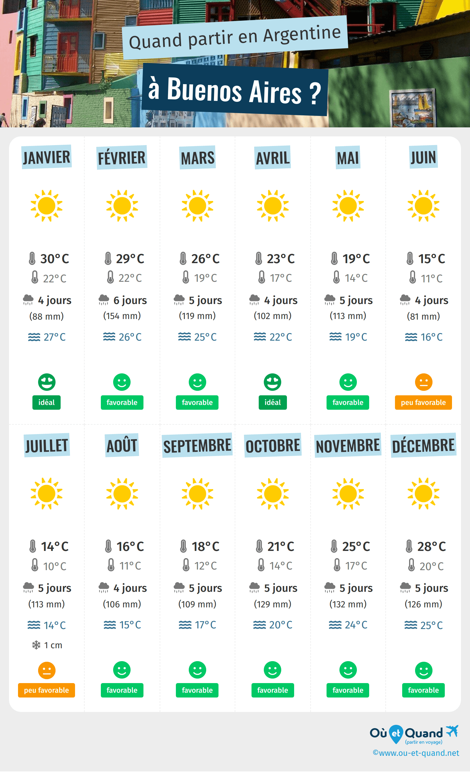 Quand partir à Buenos Aires ? Voici quelques informations statistiques sur la météo à Buenos Aires pour vous aider à trouver la meilleure période pour votre voyage :