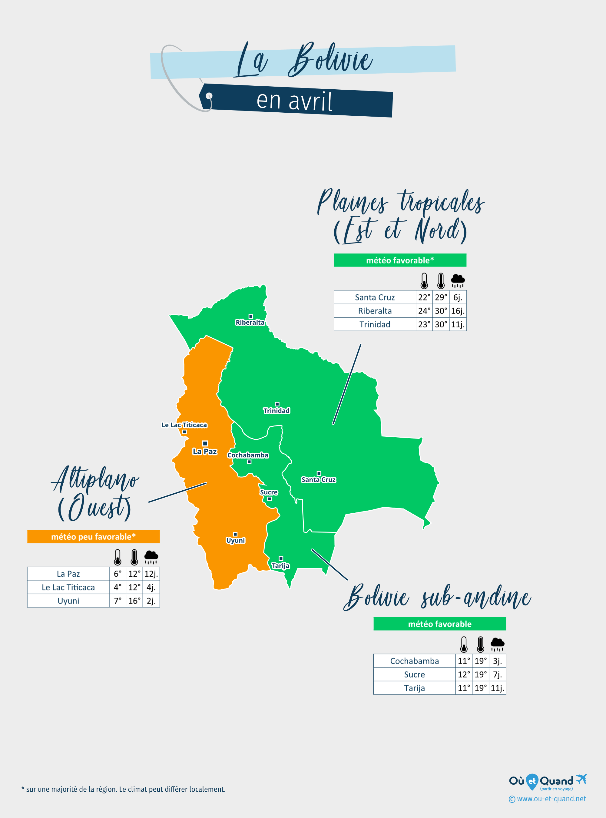 | Plaines tropicales (Est et Nord) en avril (Santa Cruz de la Sierra, Riberalta, Trinidad...) | 18 à 31°C | 5 à 16 jours | favorable* |