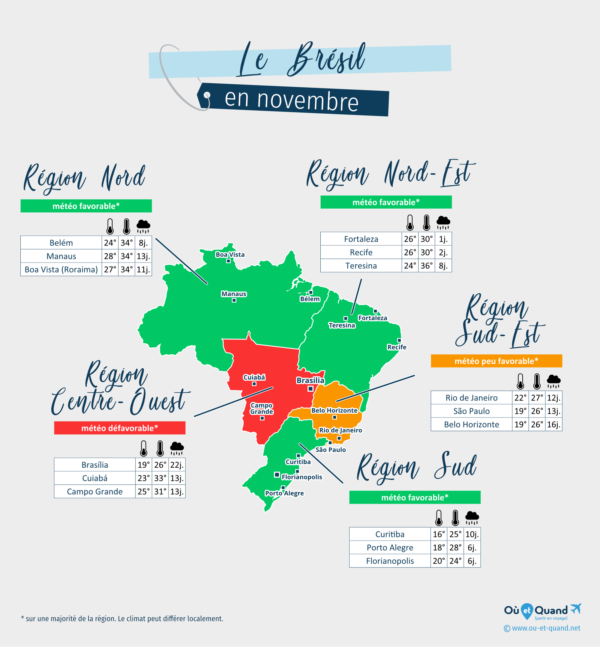 Utilisez les onglets ci-dessous pour découvrir la météo en novembre dans chaque zone du Brésil et consulter les normales saisonnières des principales villes.