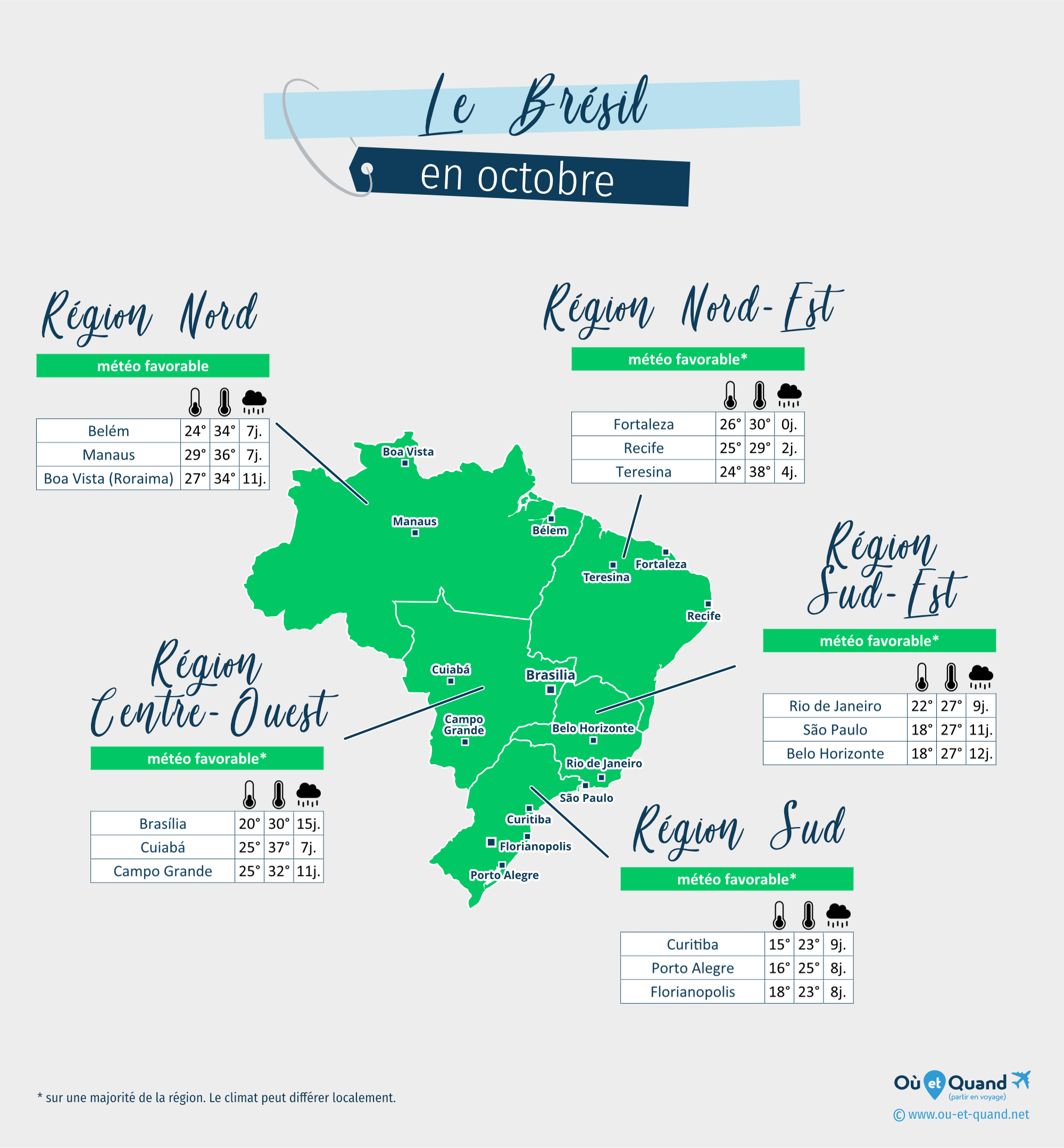 Utilisez les onglets ci-dessous pour découvrir la météo en octobre dans chaque zone du Brésil et consulter les normales saisonnières des principales villes.