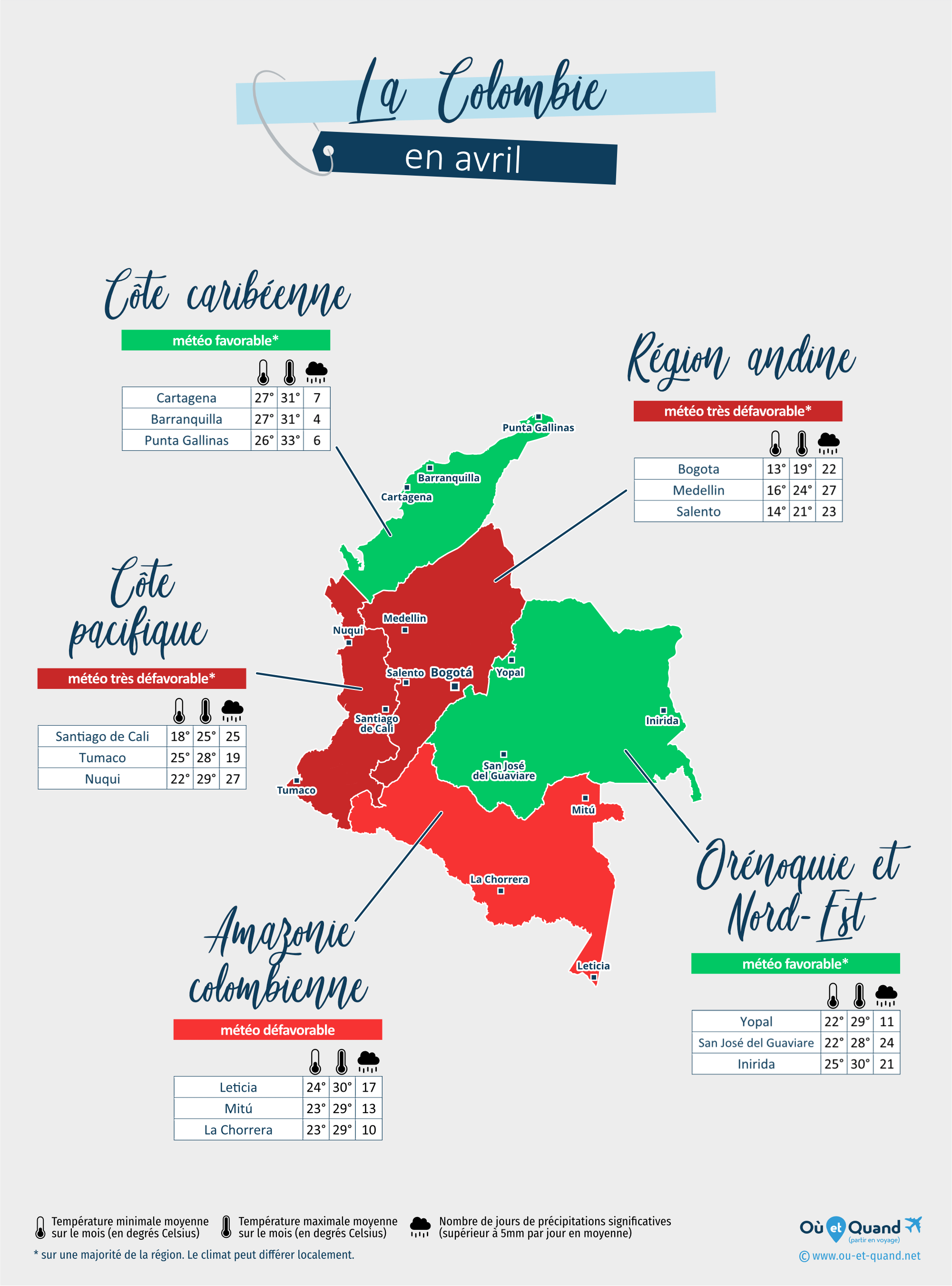 | Amazonie colombienne de la Colombie en avril (Leticia, Mitú, La Chorrera...) | 28 à 30°C | 10 à 23 jours | défavorable | |