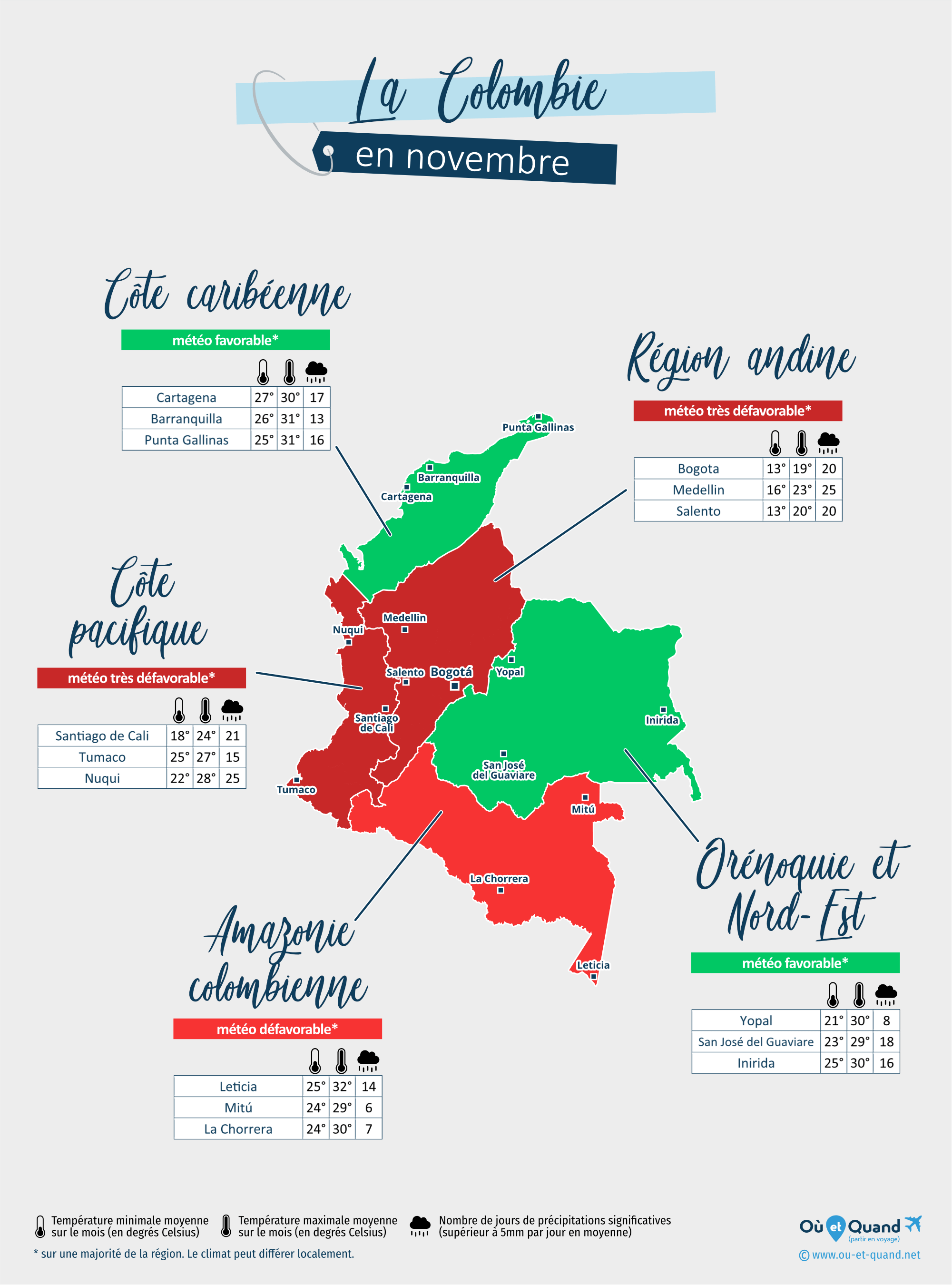| Région andine en novembre (Bogotá, Medellin, Salento...) | 16 à 34°C | 7 à 27 jours | très défavorable* | |