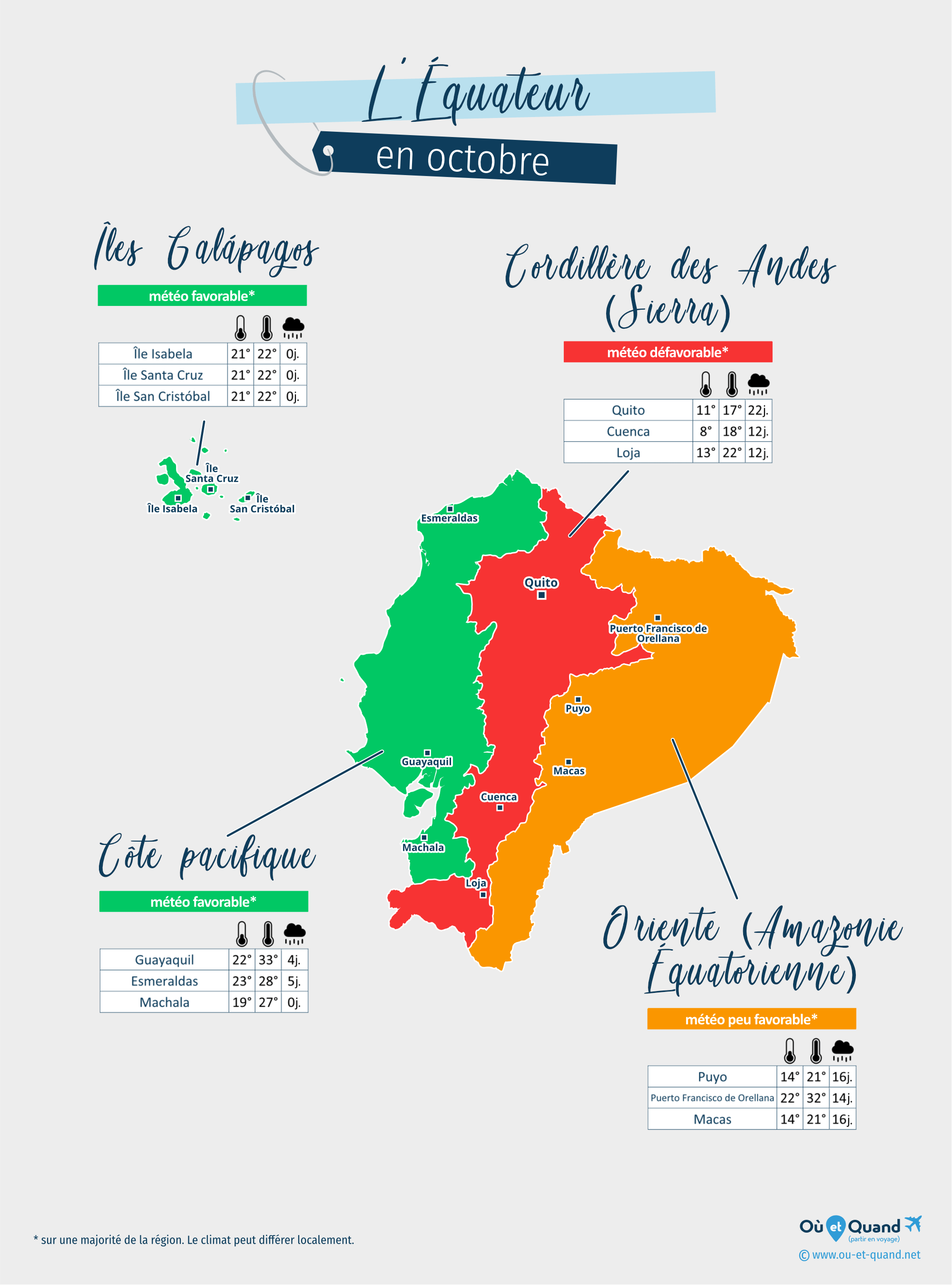 Découvrez sur la carte ci-dessous où aller en Équateur pour visiter cette destination au mois d'octobre avec les meilleures conditions climatiques.