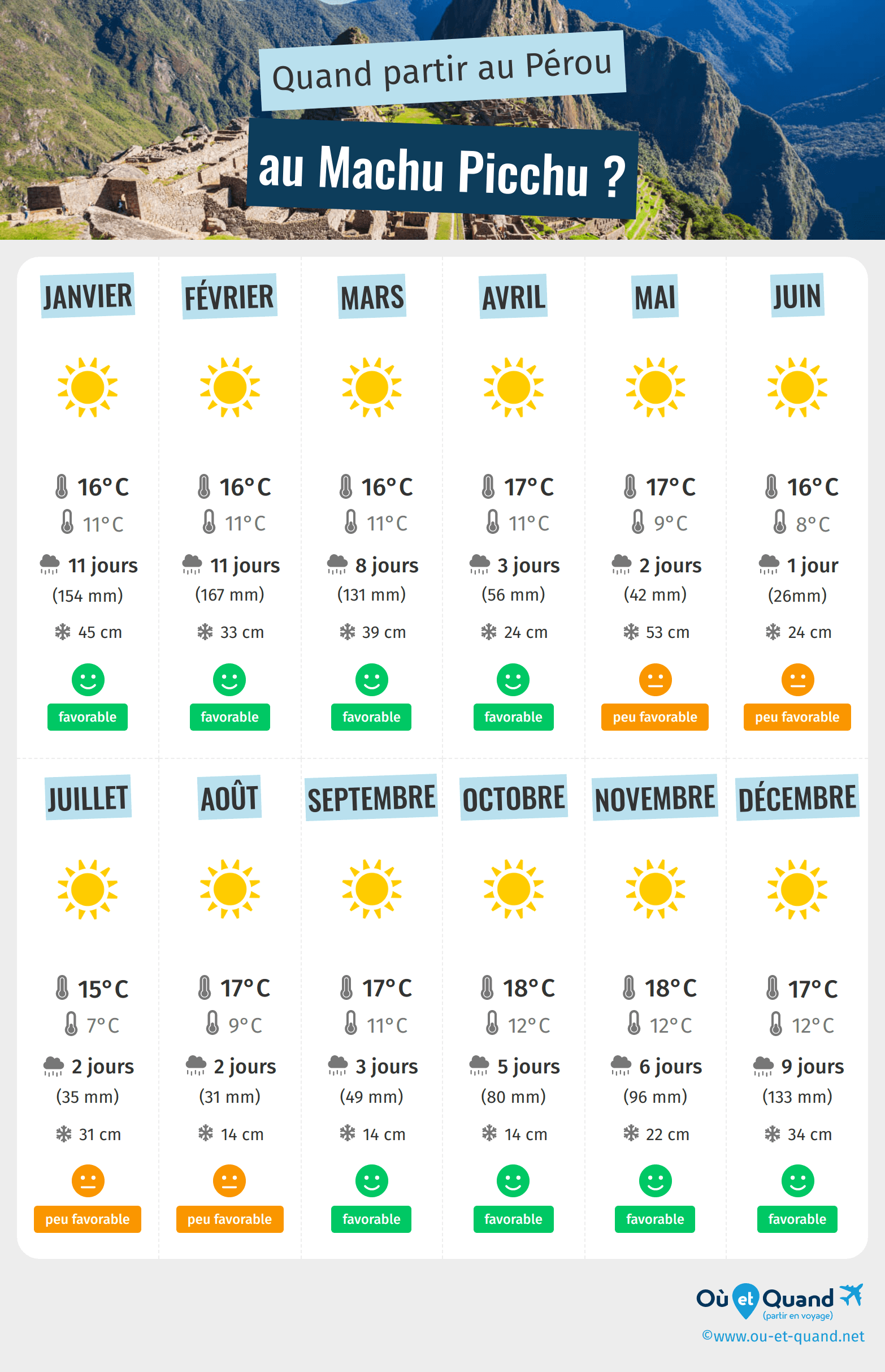 Pour obtenir toutes les informations sur le climat et la météo Au Machu Picchu d'un mois précis, cliquez sur le lien correspondant ci-dessous :