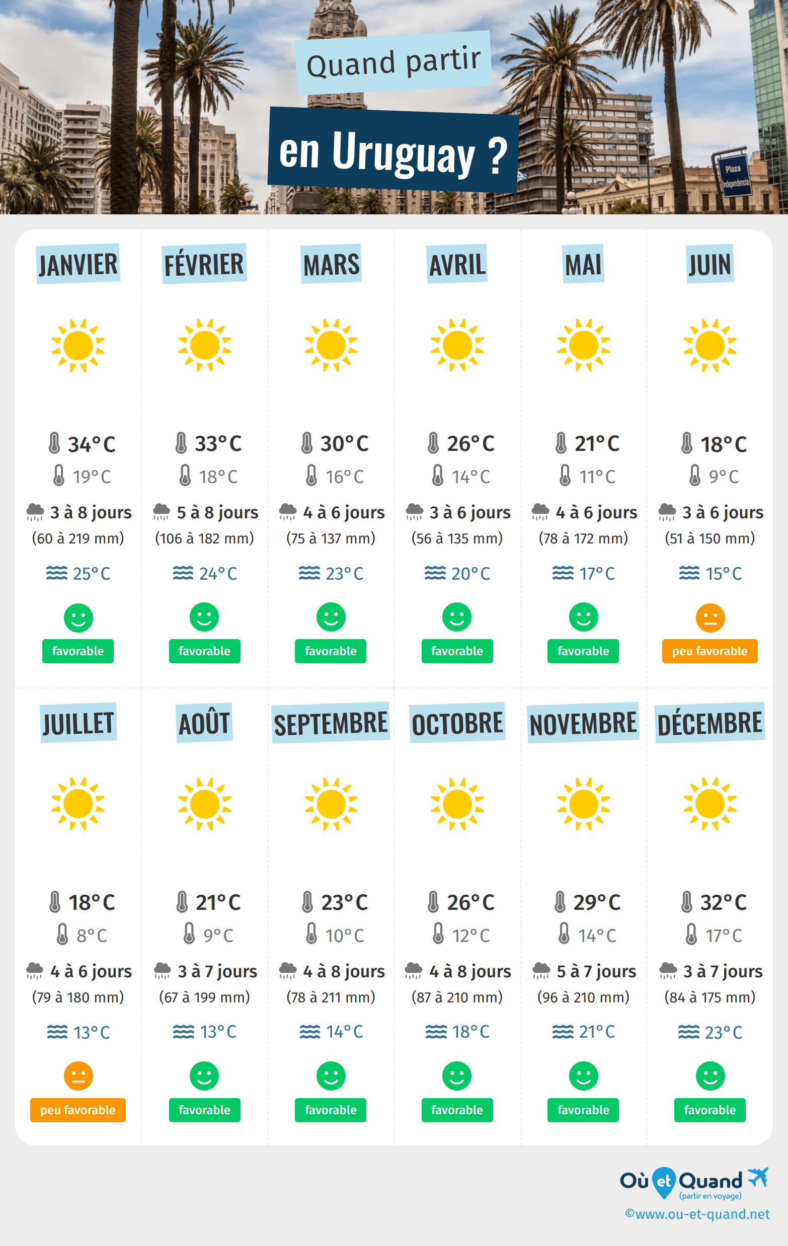 Climat, météo, saisons, fêtes et événements, affluence et saisons touristiques, évolution des prix mois par mois... Trouvez la meilleure période et la meilleure destination pour votre voyage en Uruguay !