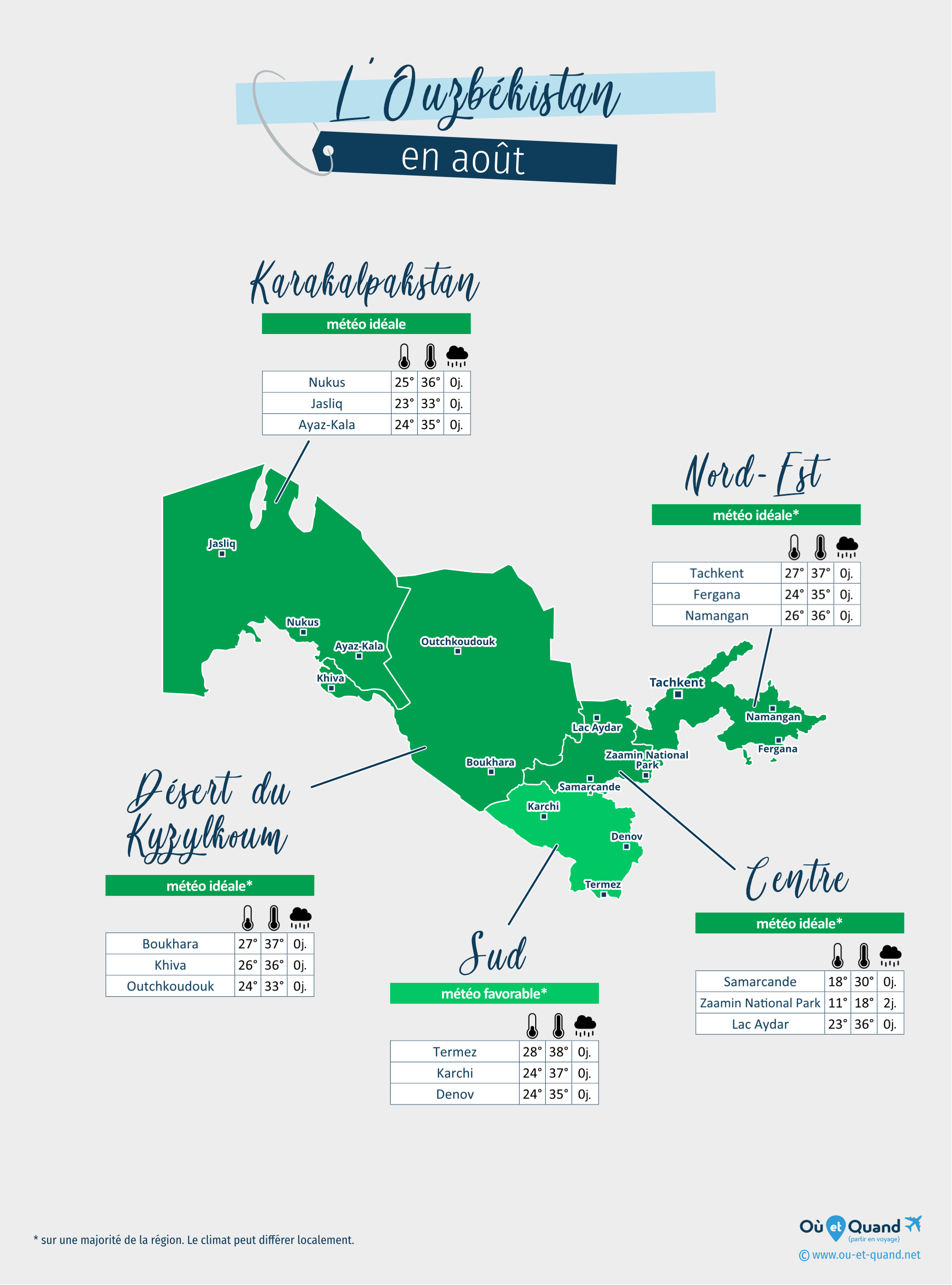 | Centre de l'Ouzbékistan en août (Samarcande, Zaamin National Park, Lac Aydar...) | 18 à 36°C | 0 à 2 jours | idéal* |