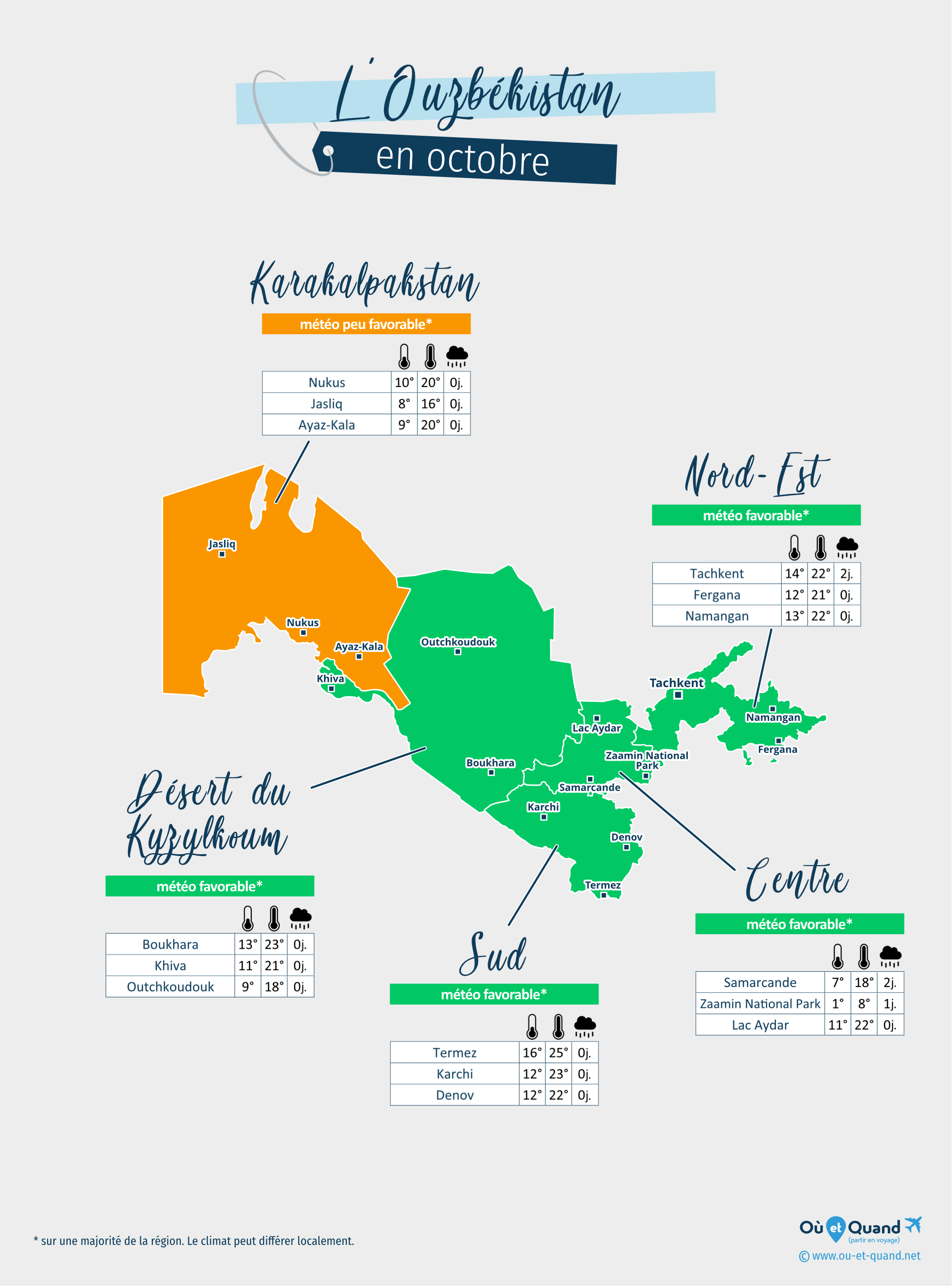 | Karakalpakstan en octobre (Nukus, Jasliq, Ayaz-Kala...) | 14 à 20°C | 0 jour | peu favorable* |