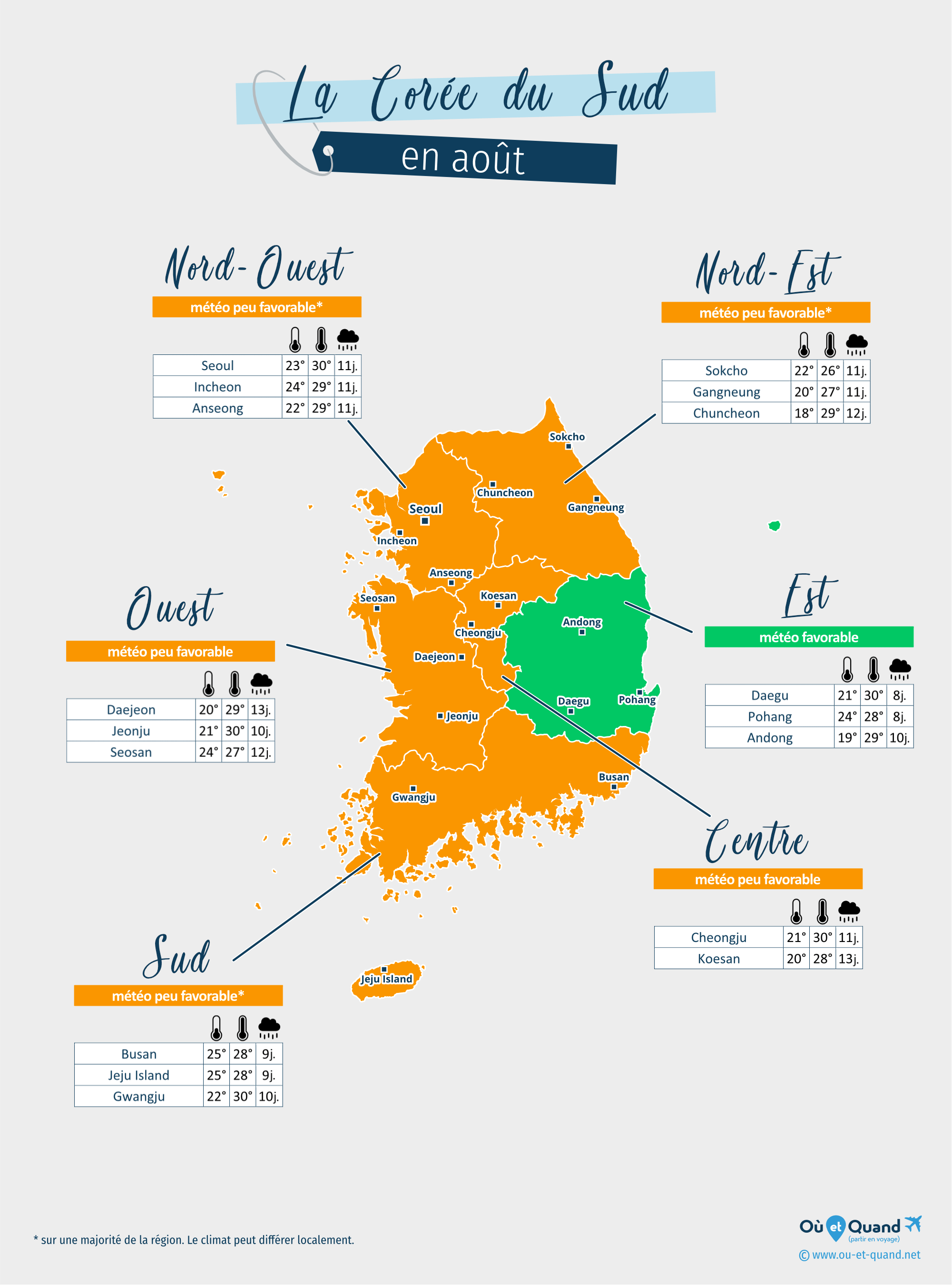 | Sud de la Corée du Sud en août (Busan, Jeju Island, Gwangju...) | 29 à 31°C | 8 à 11 jours | 26 à 27°C | peu favorable* |