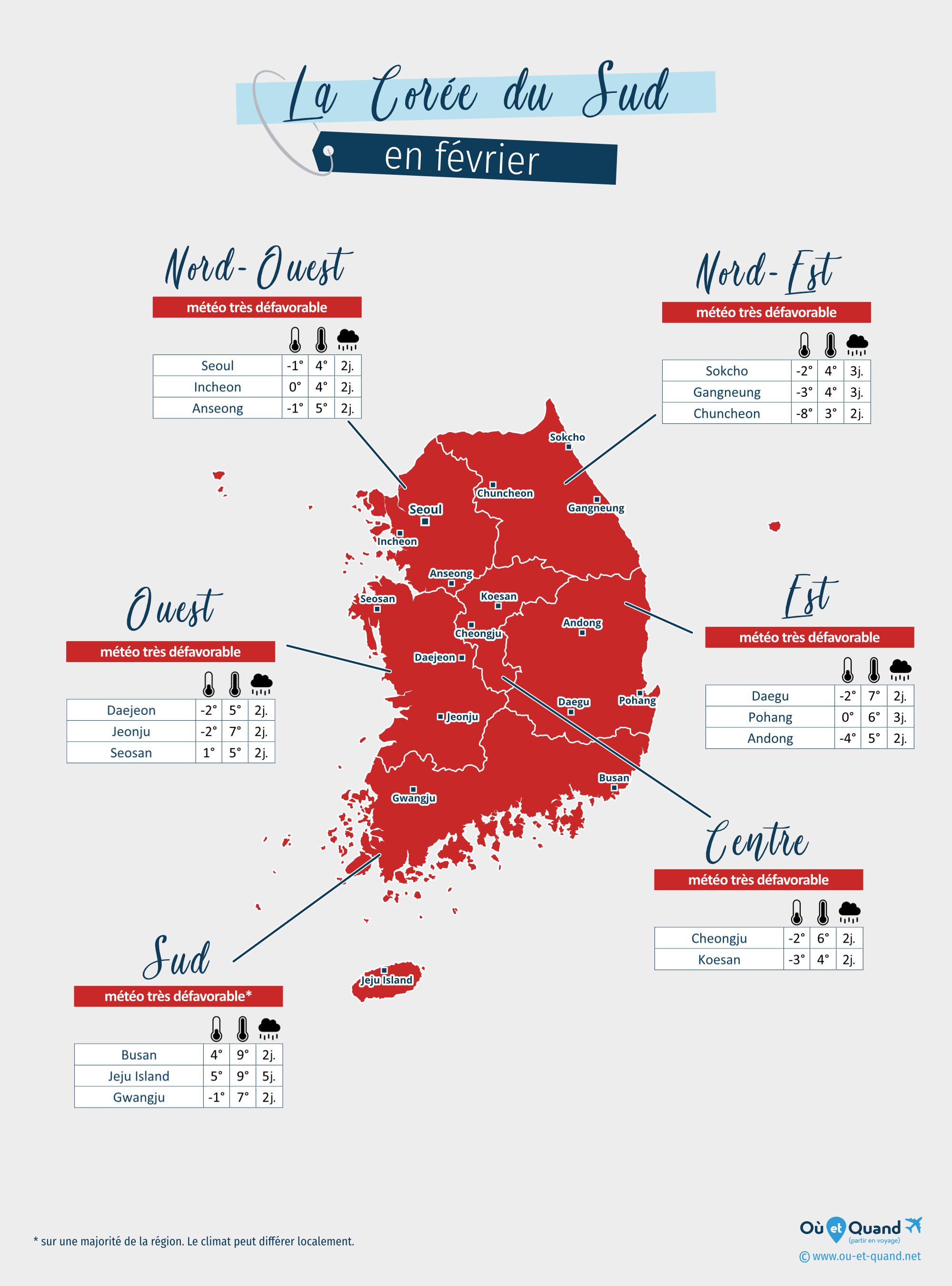 | Nord-Est de la Corée du Sud en février (Sokcho, Gangneung, Chuncheon...) | 2 à 4°C | 2 à 3 jours | 8 à 9°C | très défavorable |