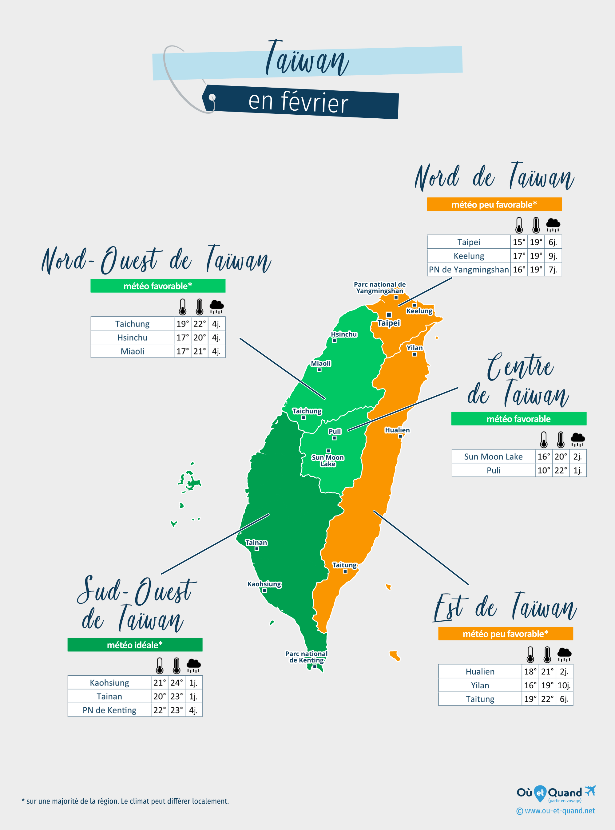 | Nord-Ouest de Taïwan en février (Taichung, Hsinchu, Miaoli...) | 20 à 23°C | 4 à 5 jours | 19°C | favorable* |