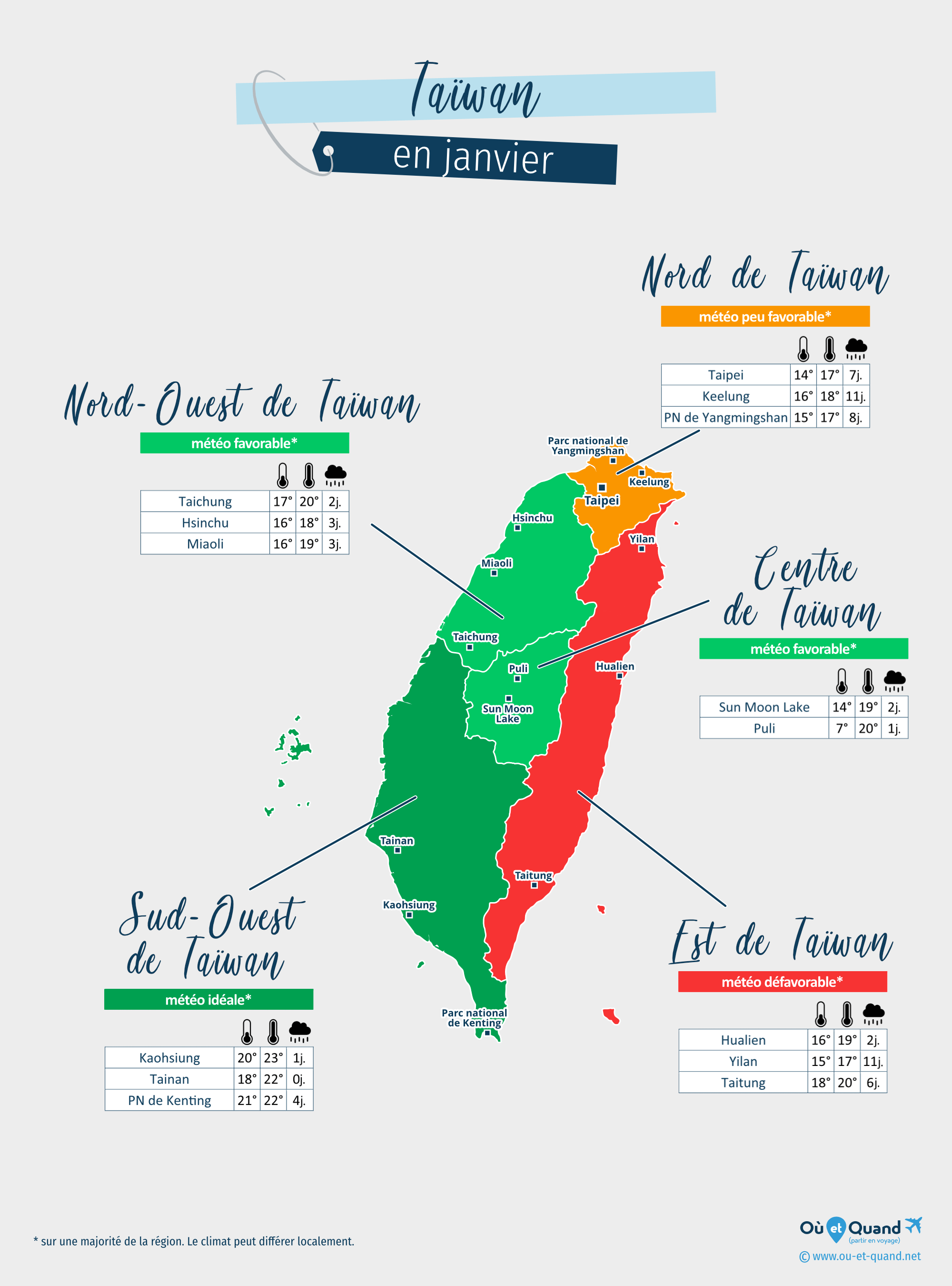 | Nord de Taïwan en janvier (Taipei, Keelung, Parc national de Yangmingshan...) | 17 à 18°C | 7 à 11 jours | 21°C | peu favorable* |