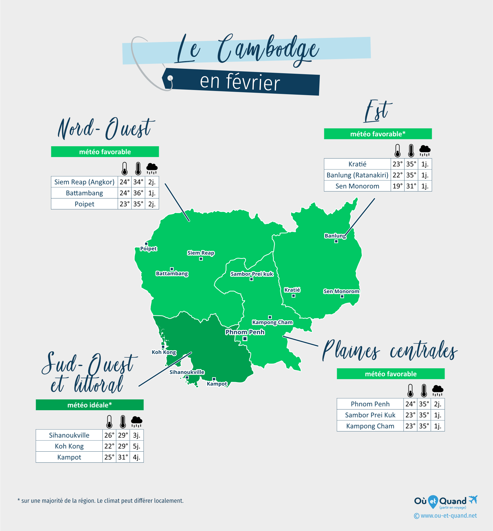 Découvrez sur la carte ci-dessous où aller au Cambodge pour visiter cette destination au mois de février avec les meilleures conditions climatiques.
