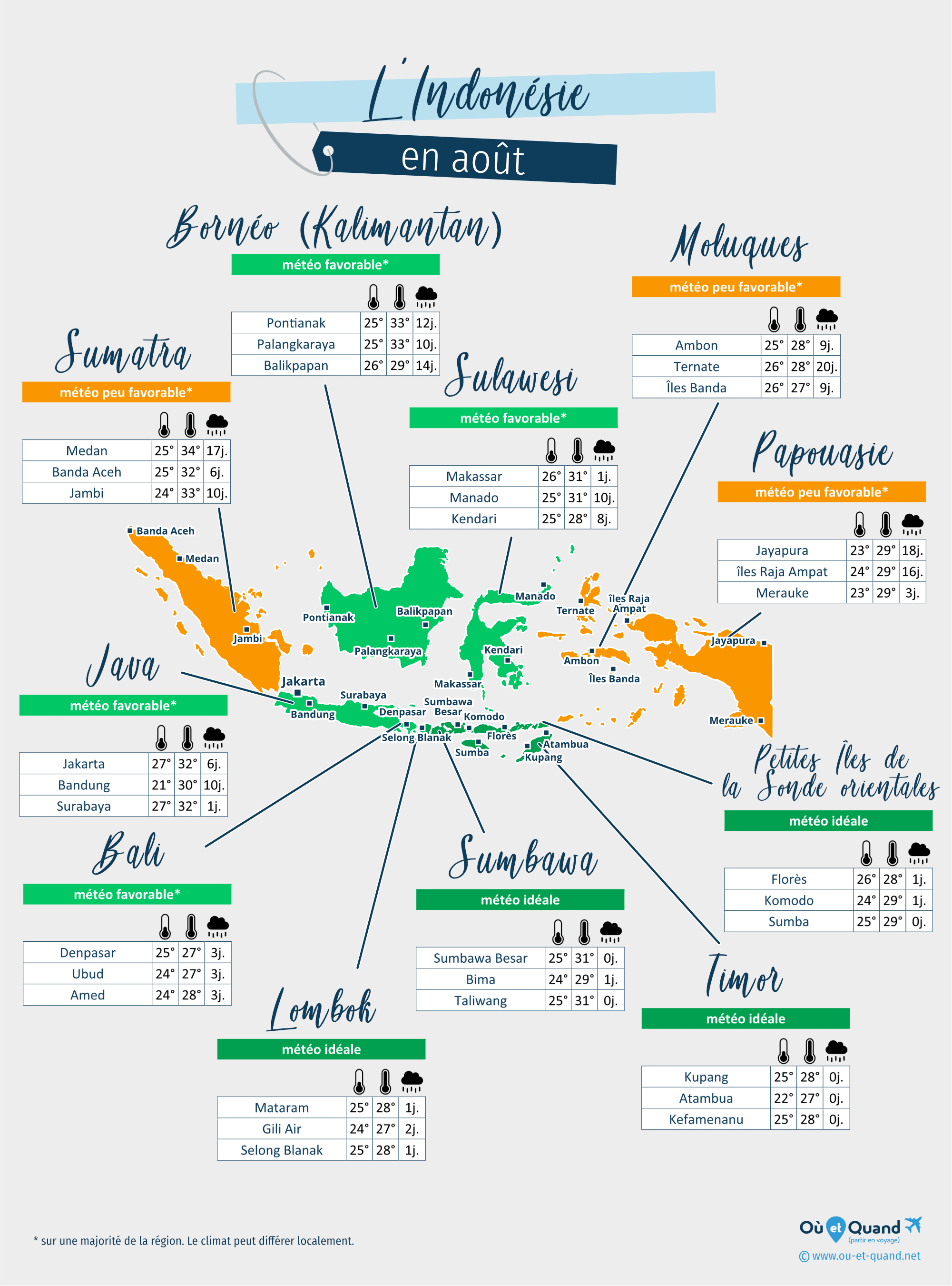 | Sumbawa en août (Sumbawa Besar, Bima, Taliwang...) | 30 à 31°C | 0 à 1 jours | 27 à 28°C | idéal |