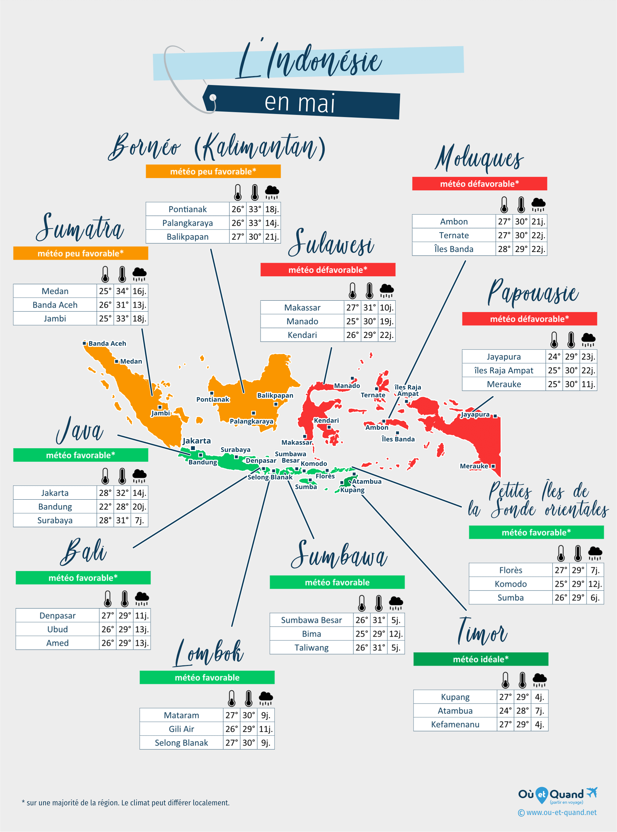 | Sulawesi en mai (Makassar, Manado, Kendari...) | 27 à 32°C | 10 à 27 jours | 29 à 31°C | défavorable* |