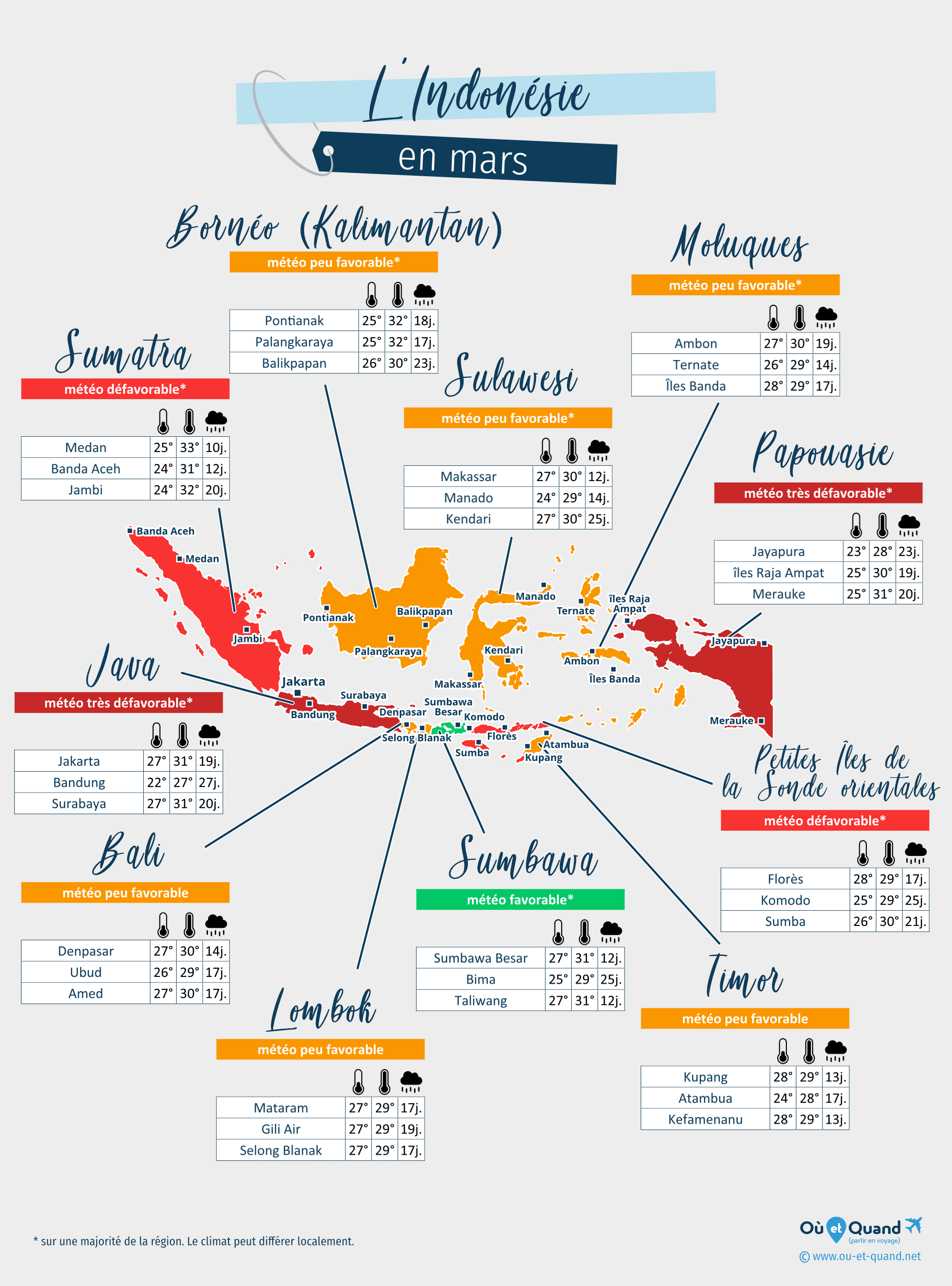 | Sulawesi en mars (Makassar, Manado, Kendari...) | 27 à 33°C | 9 à 30 jours | 29 à 31°C | peu favorable* |