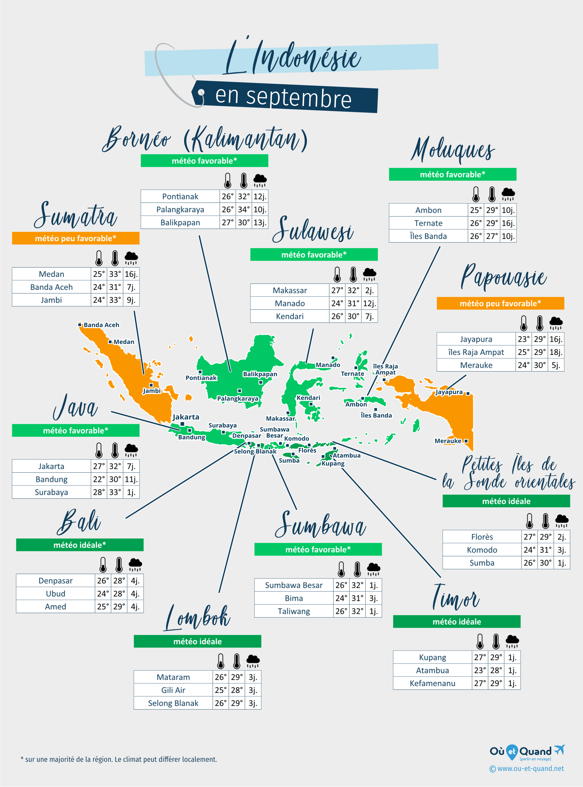 | Sumatra en septembre (Medan, Palembang, Padang...) | 26 à 35°C | 6 à 22 jours | 28 à 30°C | peu favorable* |
