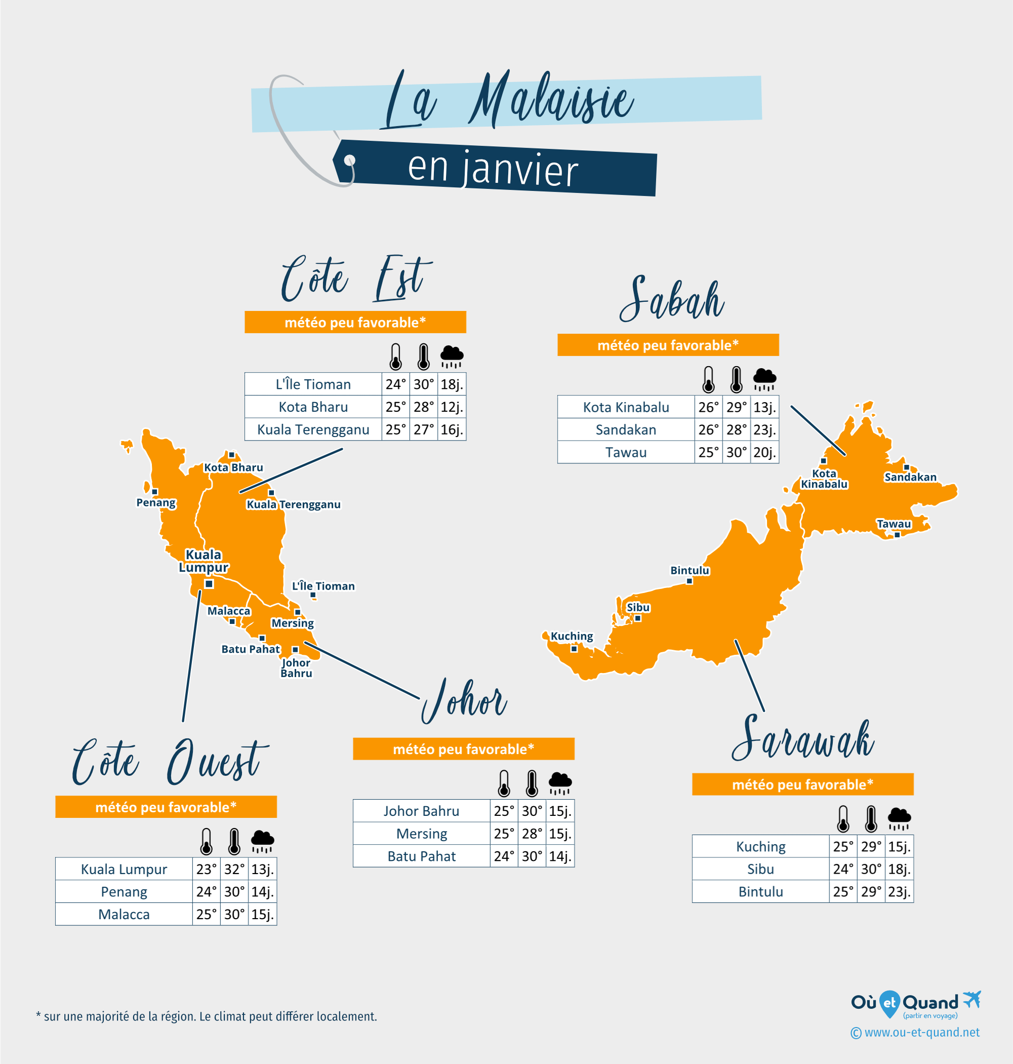 | Côte Est de la Malaisie en janvier (L'Île Tioman, Kota Bharu, Kuala Terengganu...) | 28 à 32°C | 10 à 22 jours | 27 à 28°C | peu favorable* |