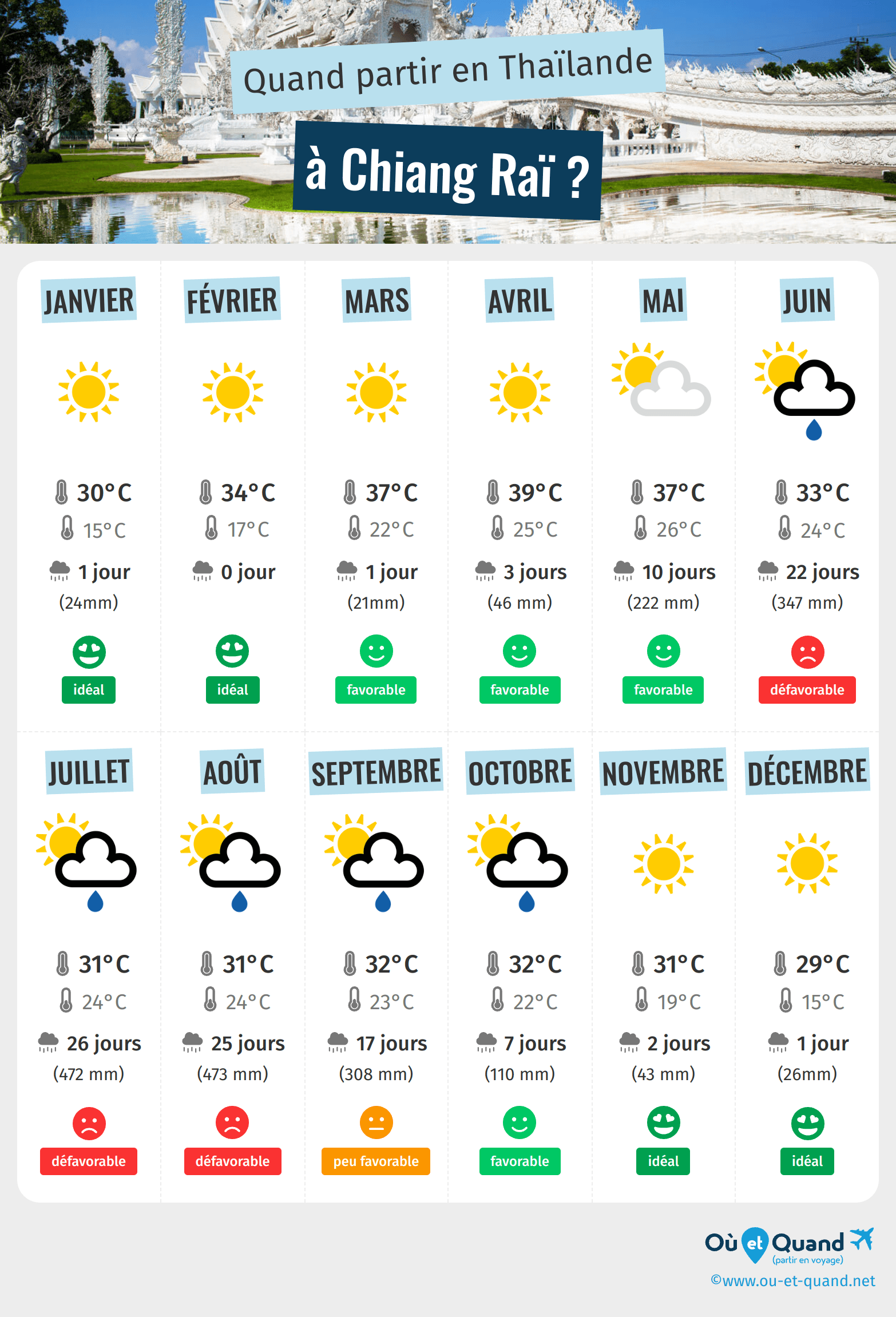 Pour obtenir toutes les informations sur le climat et la météo à Chiang Raï d'un mois précis, cliquez sur le lien correspondant ci-dessous :