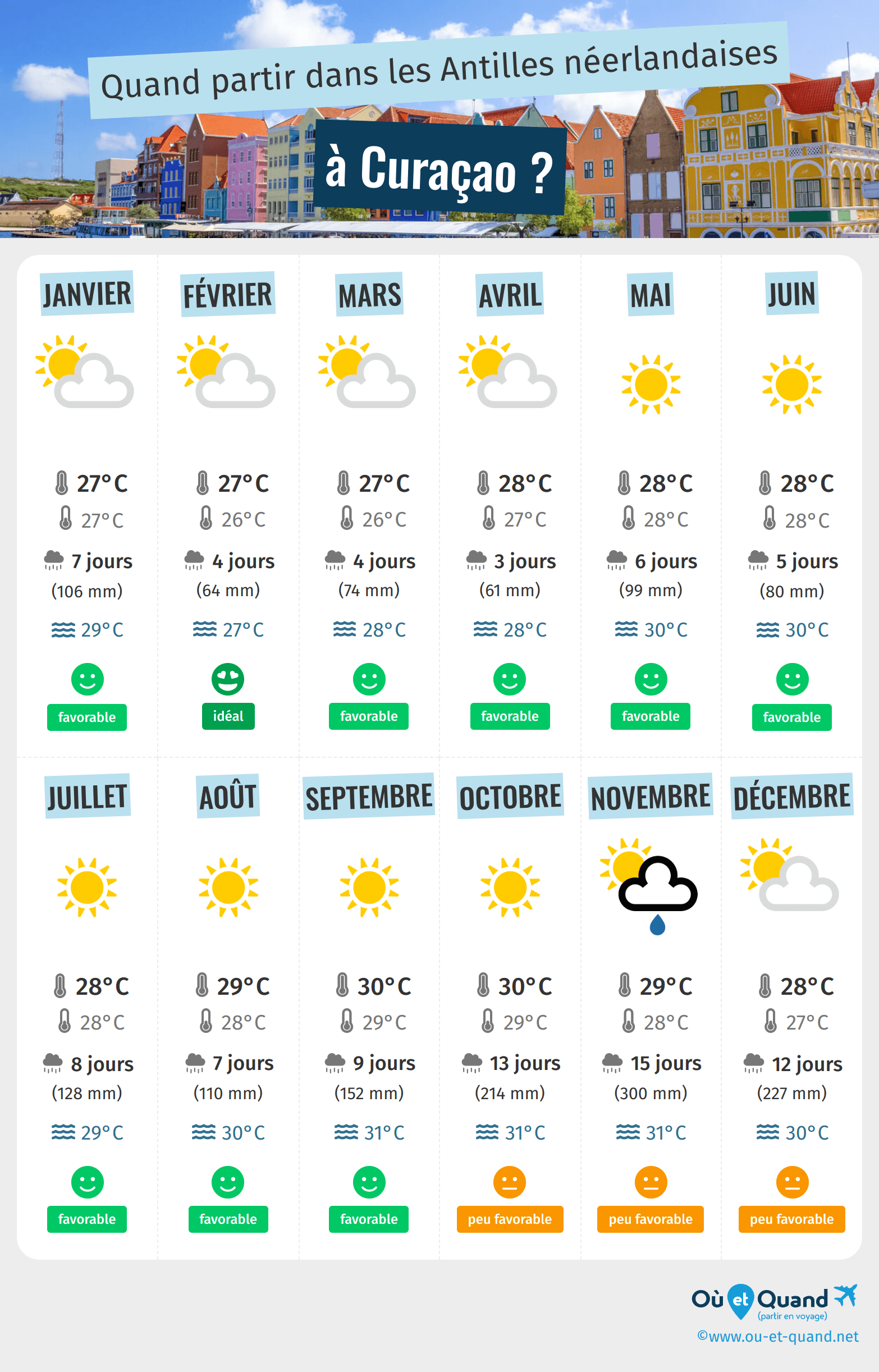 Pour obtenir toutes les informations sur le climat et la météo à Curaçao d'un mois précis, cliquez sur le lien correspondant ci-dessous :