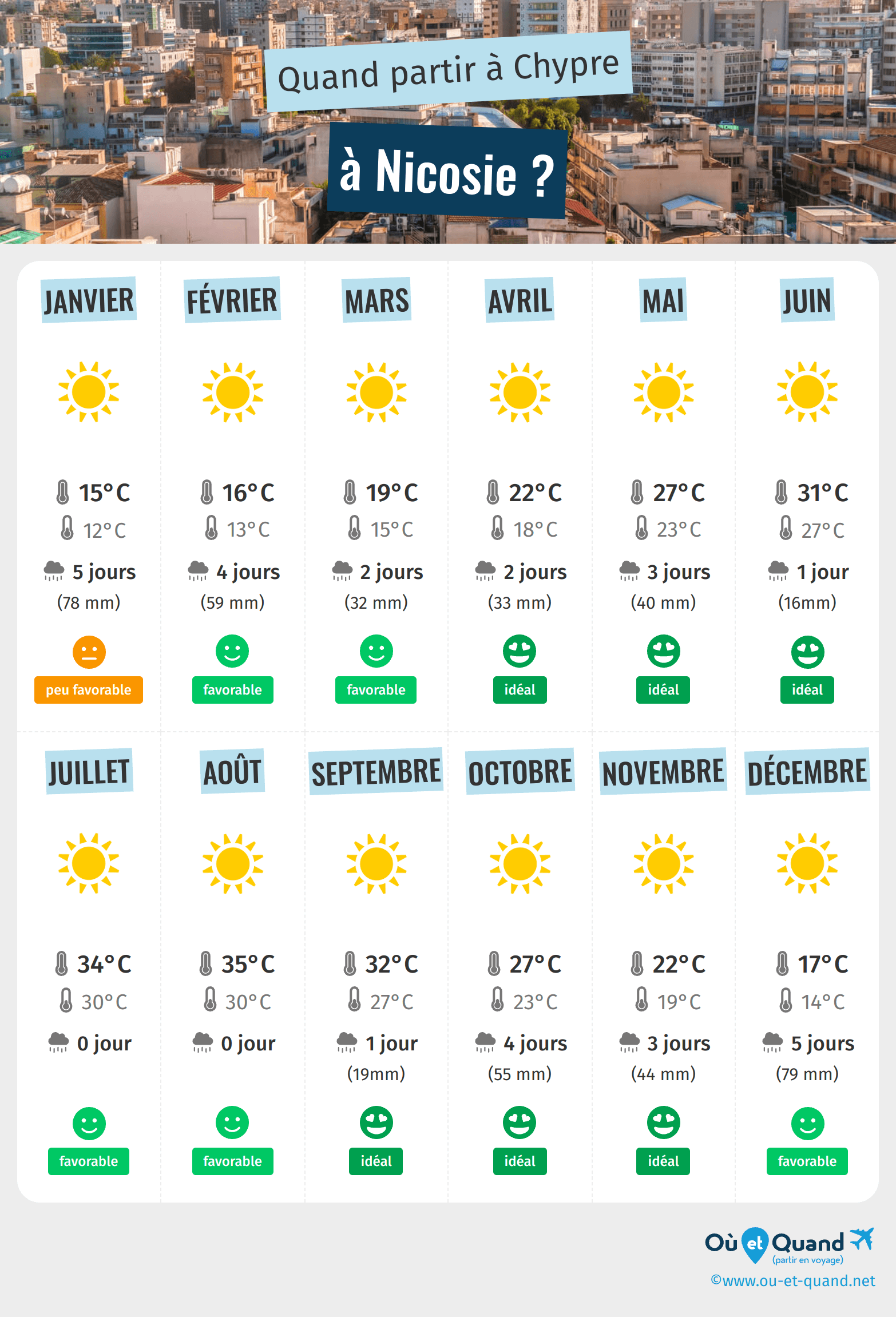La température maximale à Nicosie est en moyenne de 25°C sur l'année (de 15°C en janvier à 35°C en août). Il pleut 456mm sur l'année, avec un minimum de 2mm en juillet et un maximum de 79mm en décembre. Le climat est agréable pour partir en voyage à Nicosie de Février à Décembre, mais la météo est vraiment idéale de Avril à Juin et de Septembre à Novembre.