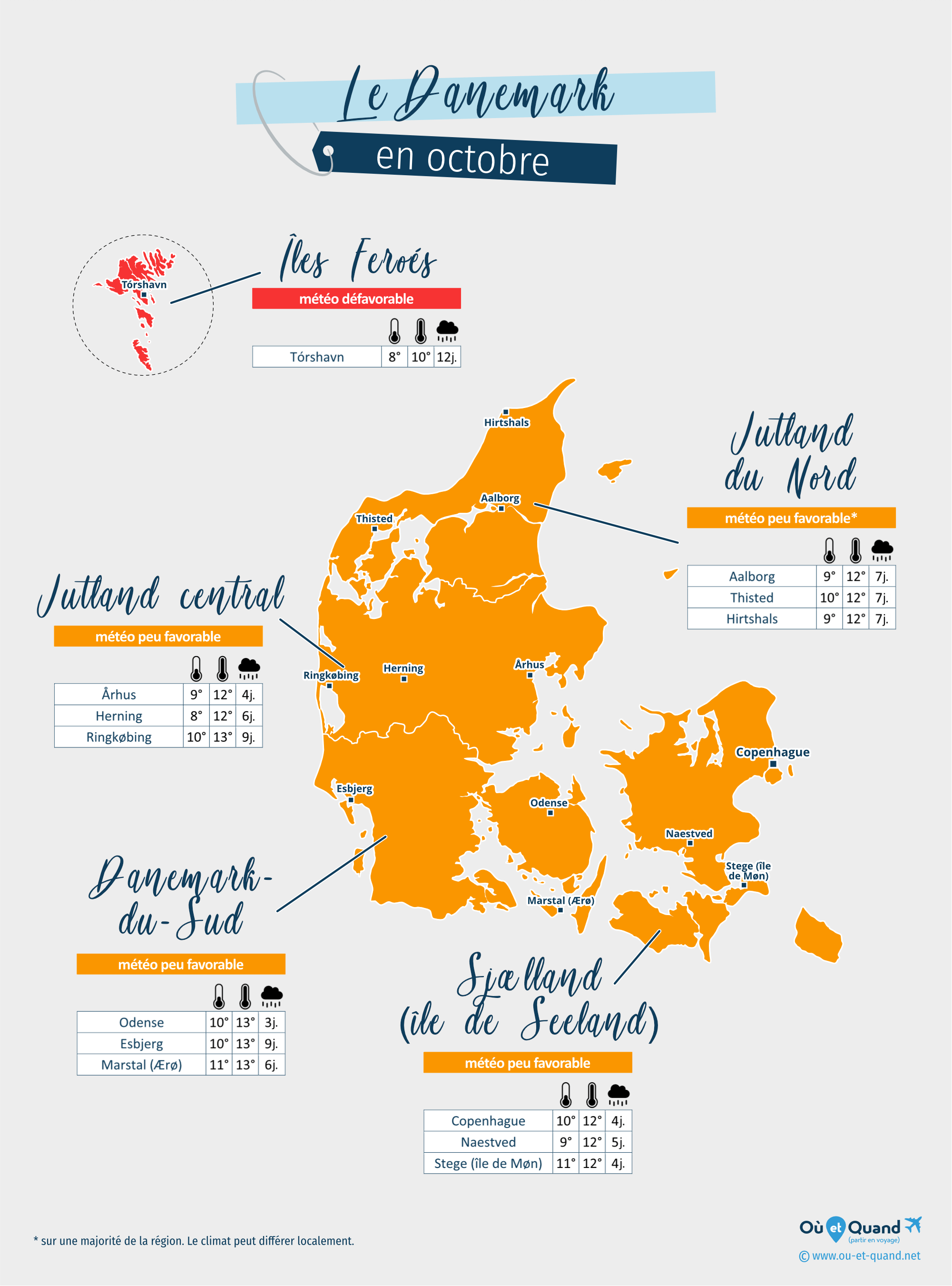 | Danemark-du-Sud en octobre (Odense, Esbjerg, Marstal (Ærø)...) | 13°C | 3 à 9 jours | 13 à 14°C | peu favorable |
