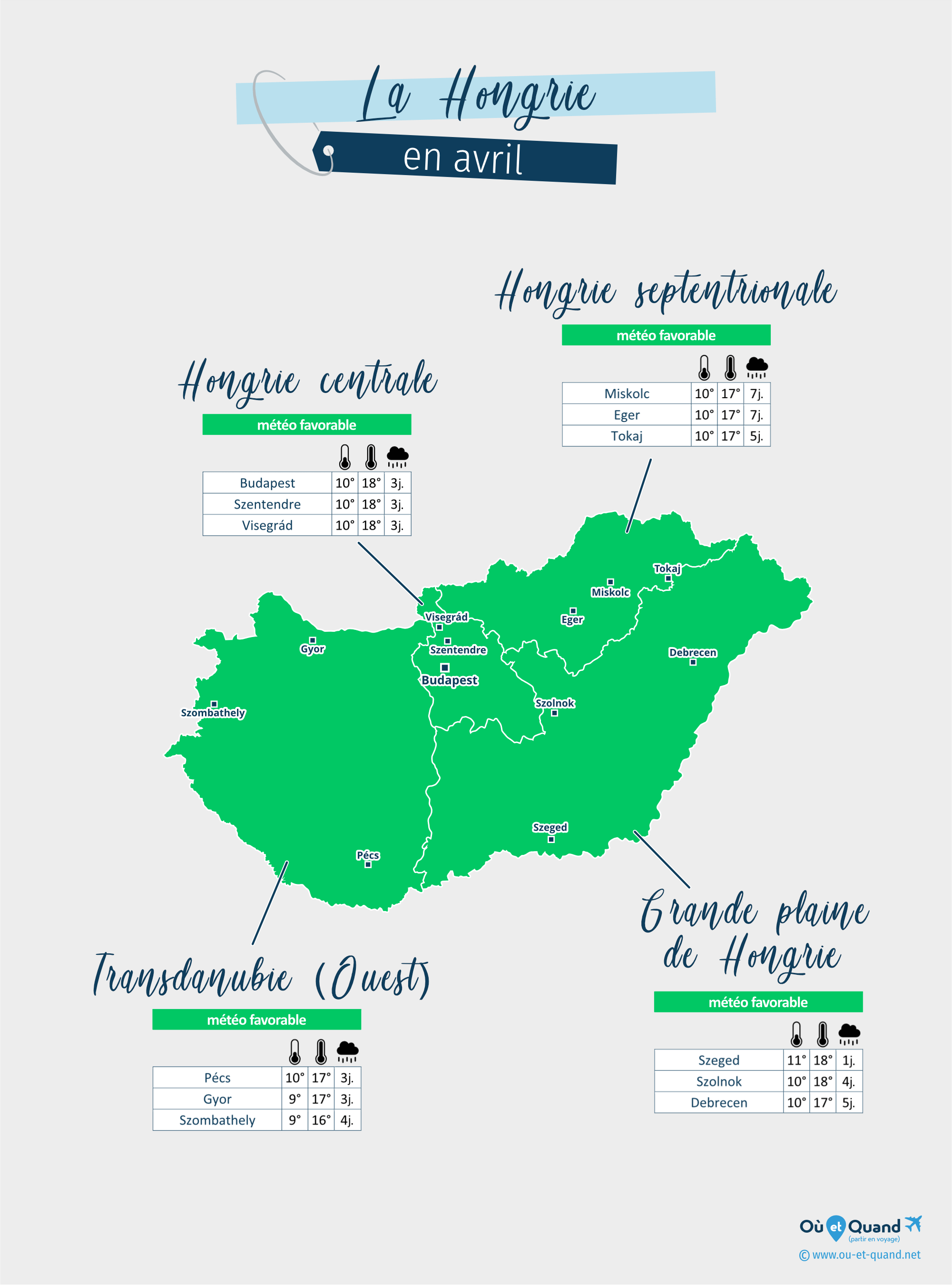 Découvrez sur la carte ci-dessous où aller en Hongrie pour visiter cette destination au mois d'avril avec les meilleures conditions climatiques.