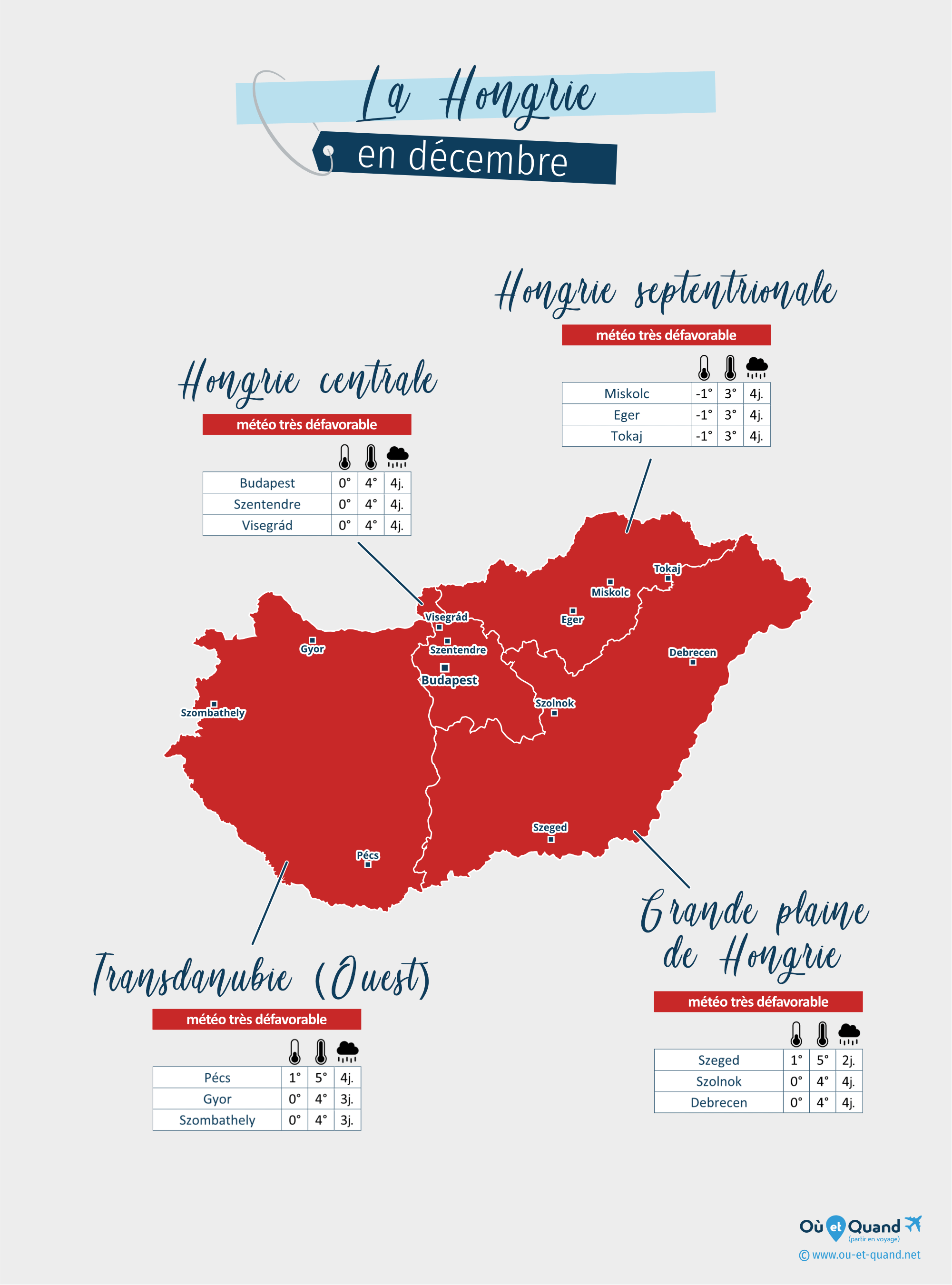 Découvrez sur la carte ci-dessous où aller en Hongrie pour visiter cette destination au mois de décembre avec les meilleures conditions climatiques.