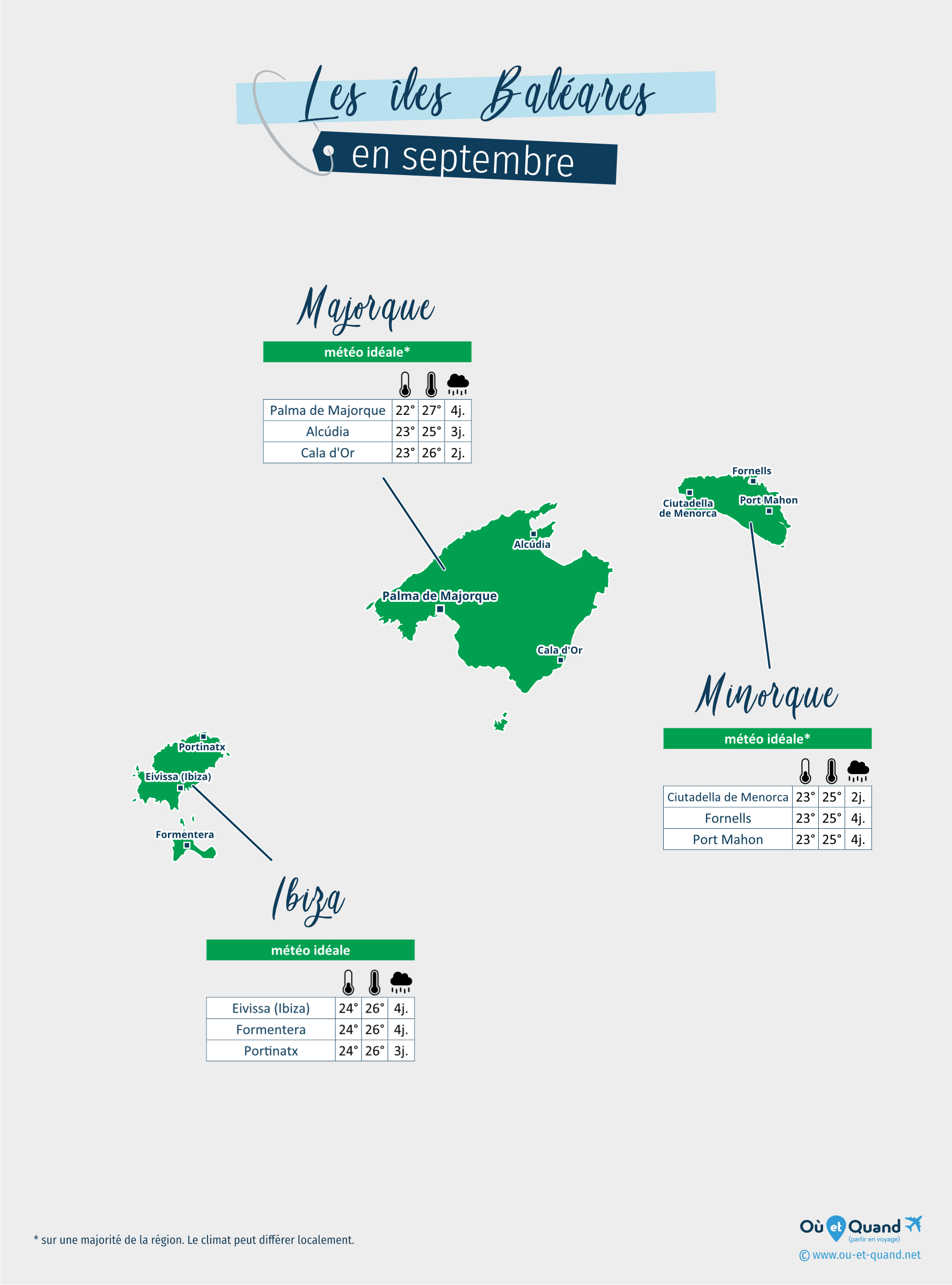 | Minorque en septembre (Ciutadella de Menorca, Fornells, Port Mahon...) | 25 à 26°C | 2 à 4 jours | 25 à 26°C | idéal* |