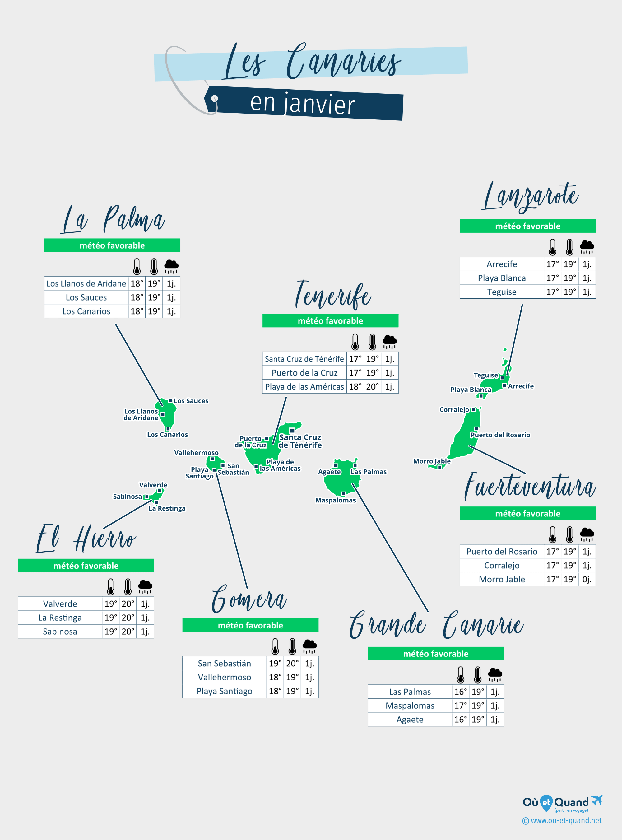 | Grande Canarie en janvier (Las Palmas, Maspalomas, Agaete...) | 20°C | 1 jour | 20 à 21°C | favorable |