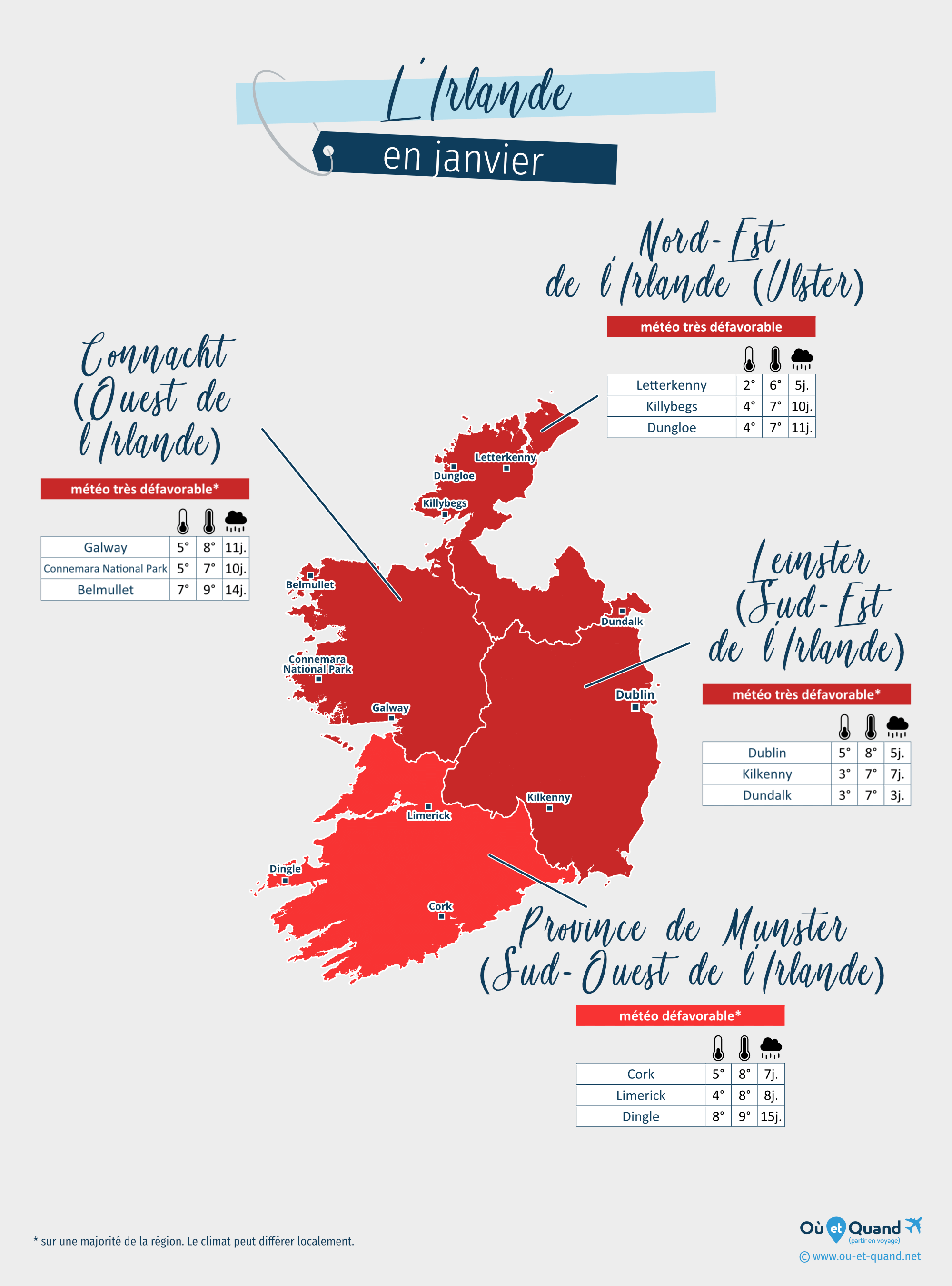 | Province de Munster (Sud-Ouest de l'Irlande) en janvier (Cork, Dingle, Limerick...) | 8 à 10°C | 5 à 15 jours | 10 à 11°C | défavorable* |