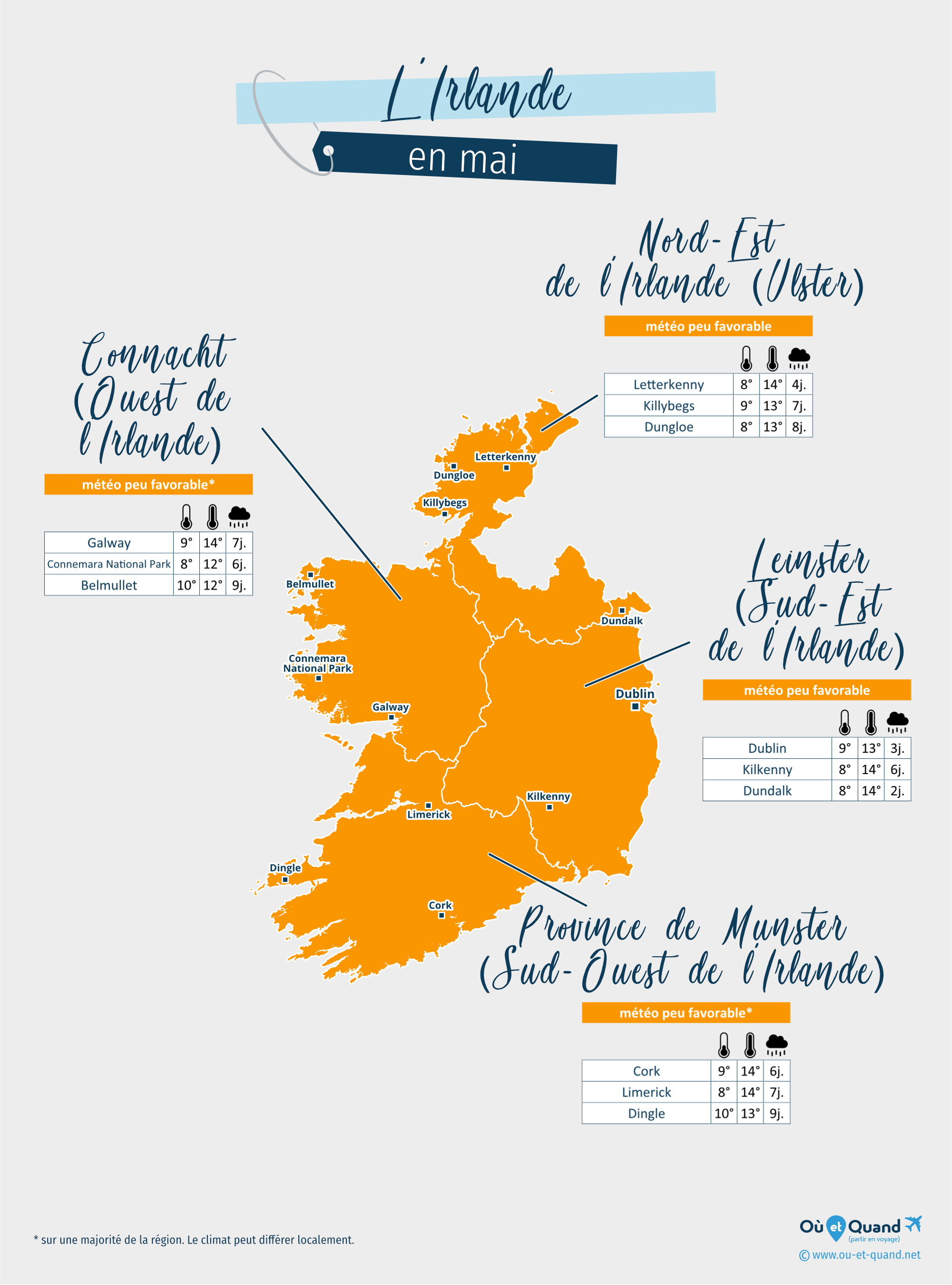 | Province de Munster (Sud-Ouest de l'Irlande) en mai (Cork, Dingle, Limerick...) | 13 à 15°C | 4 à 9 jours | 12°C | peu favorable* |