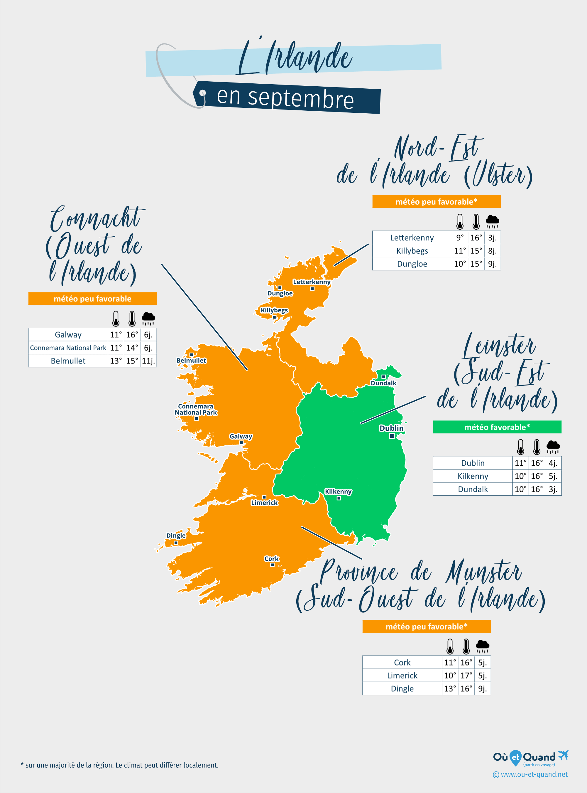 Découvrez sur la carte ci-dessous où aller en Irlande pour visiter cette destination au mois de septembre avec les meilleures conditions climatiques.