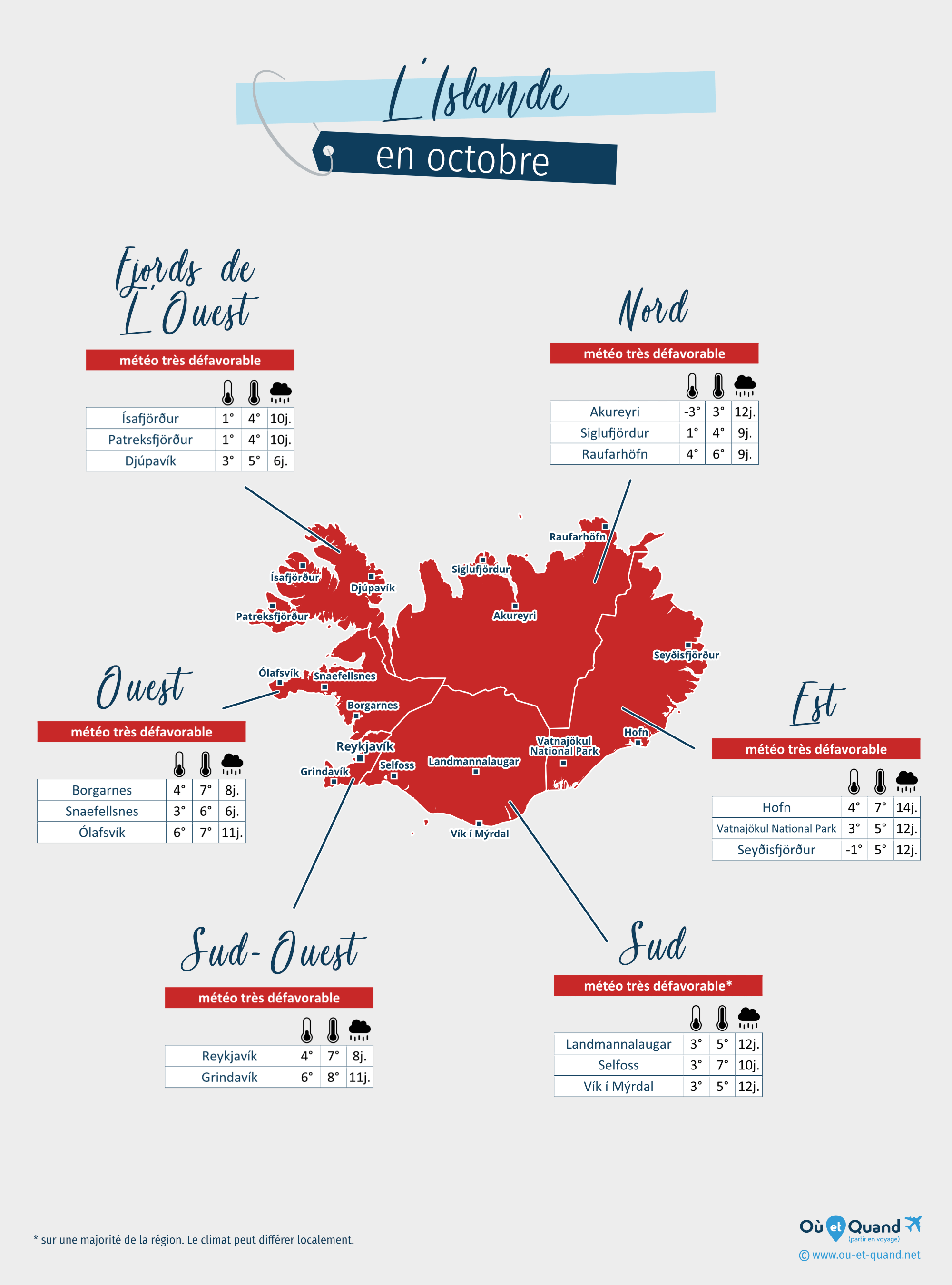 | Nord de l'Islande en octobre (Akureyri, Siglufjördur, Raufarhöfn...) | 4 à 6°C | 6 à 12 jours | 6°C | très défavorable |